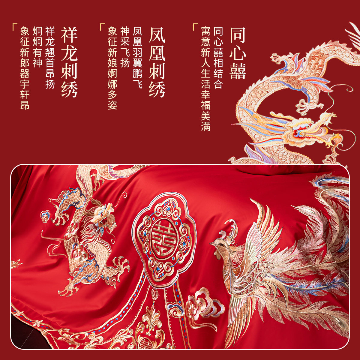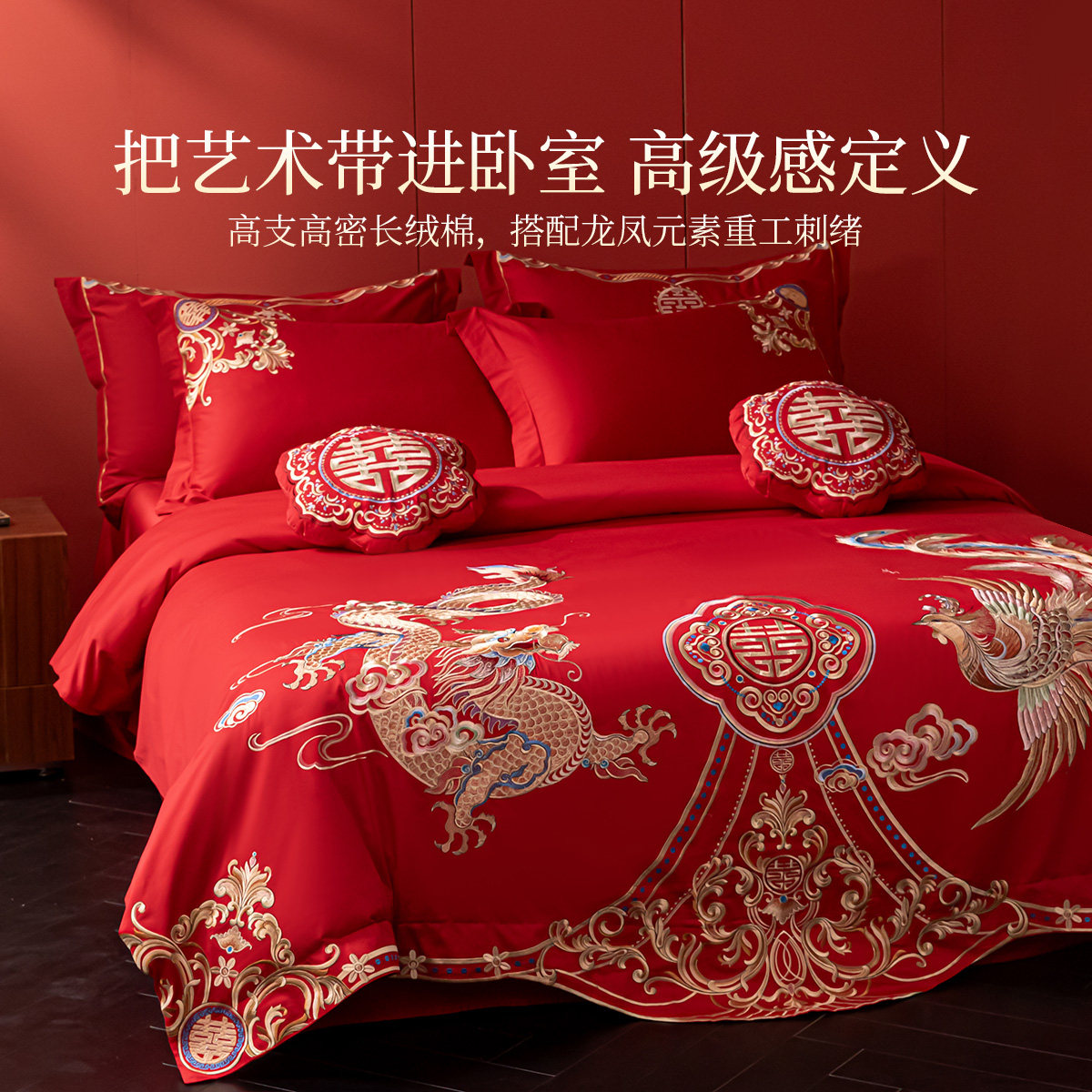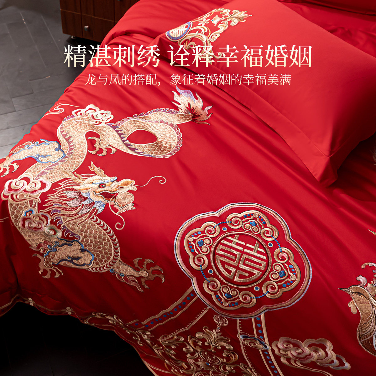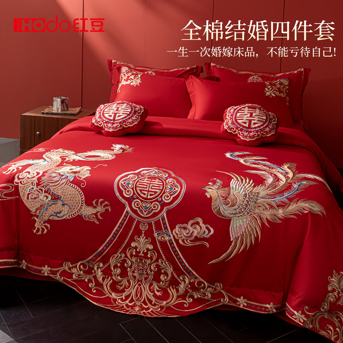 红豆全棉刺绣结婚四件套纯棉高档大红色床单被套喜被婚庆床上用品