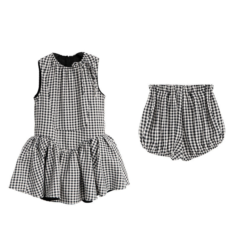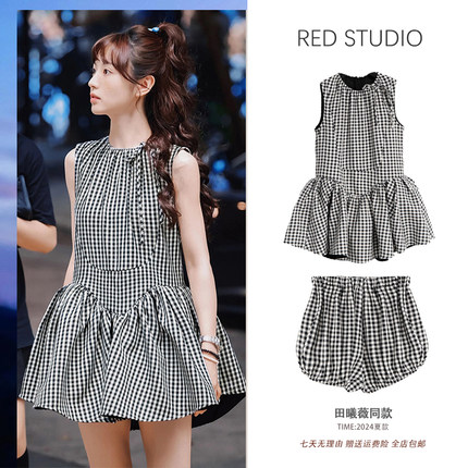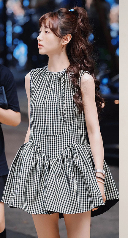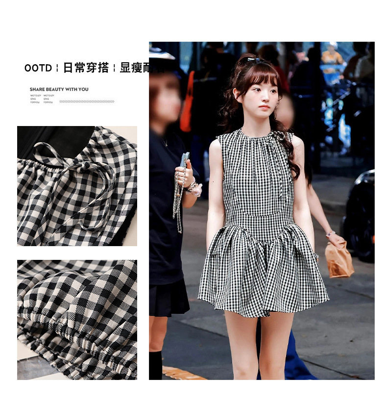 田曦薇同款千鸟格背心连衣裙高级感小个子格子蓬蓬裙法式修身短裙