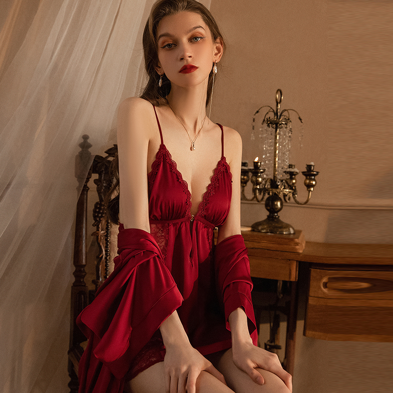 吊带睡裙女夏季冰丝2025年新款春秋睡袍套装透明蕾丝前扣性感睡衣
