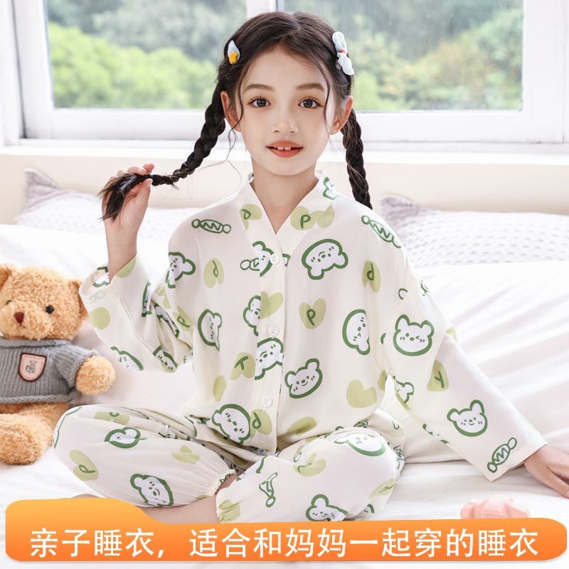 立领扩胸睡衣儿童鼻炎上衣裤子套装立领长袖棉绸空调服薄男女夏季