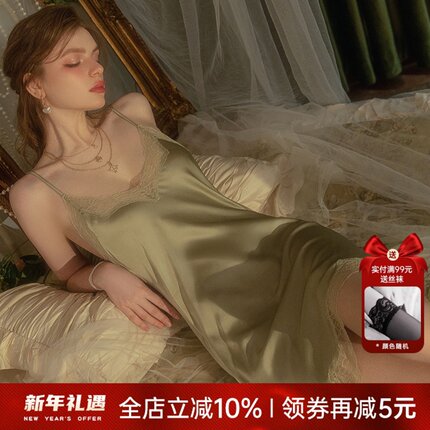 今夕何夕性感睡衣女秋冬季2025新款蕾丝纯欲风带胸垫冰丝吊带睡裙