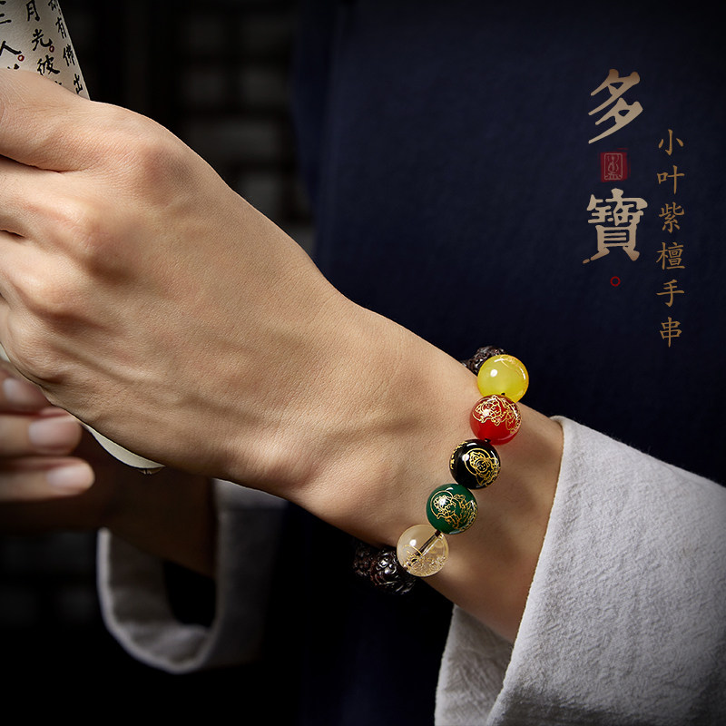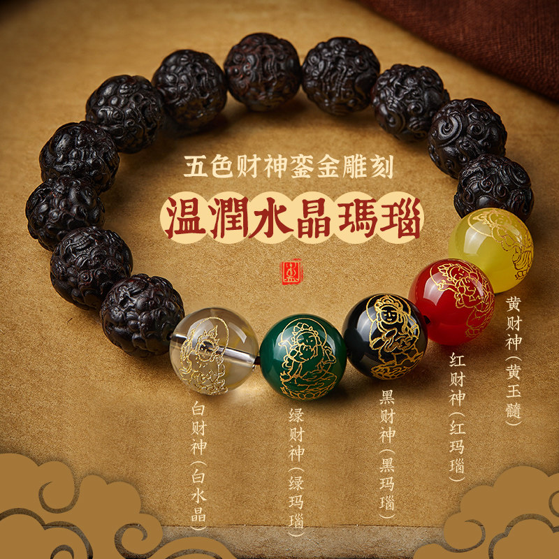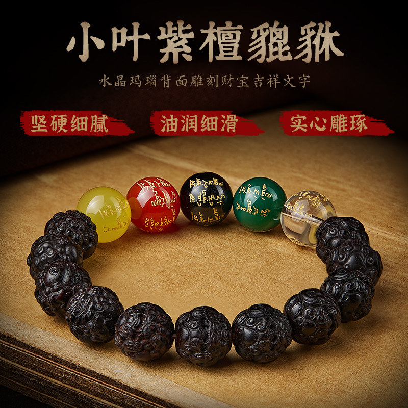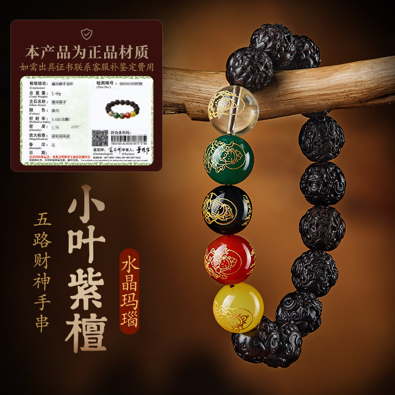 小叶紫檀手串新年礼物男女五路财神转运珠貔貅手链文玩檀香木佛珠
