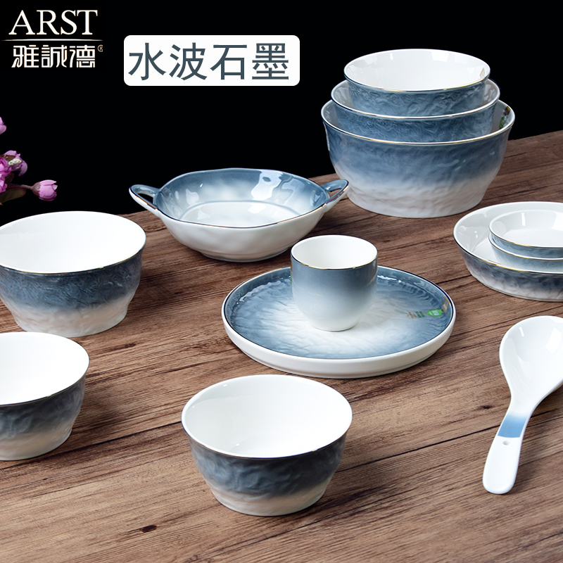 雅诚德陶瓷餐具水波石墨永佳浮雕碗面碗深欧盘圆盘鱼盘碟描金饭碗