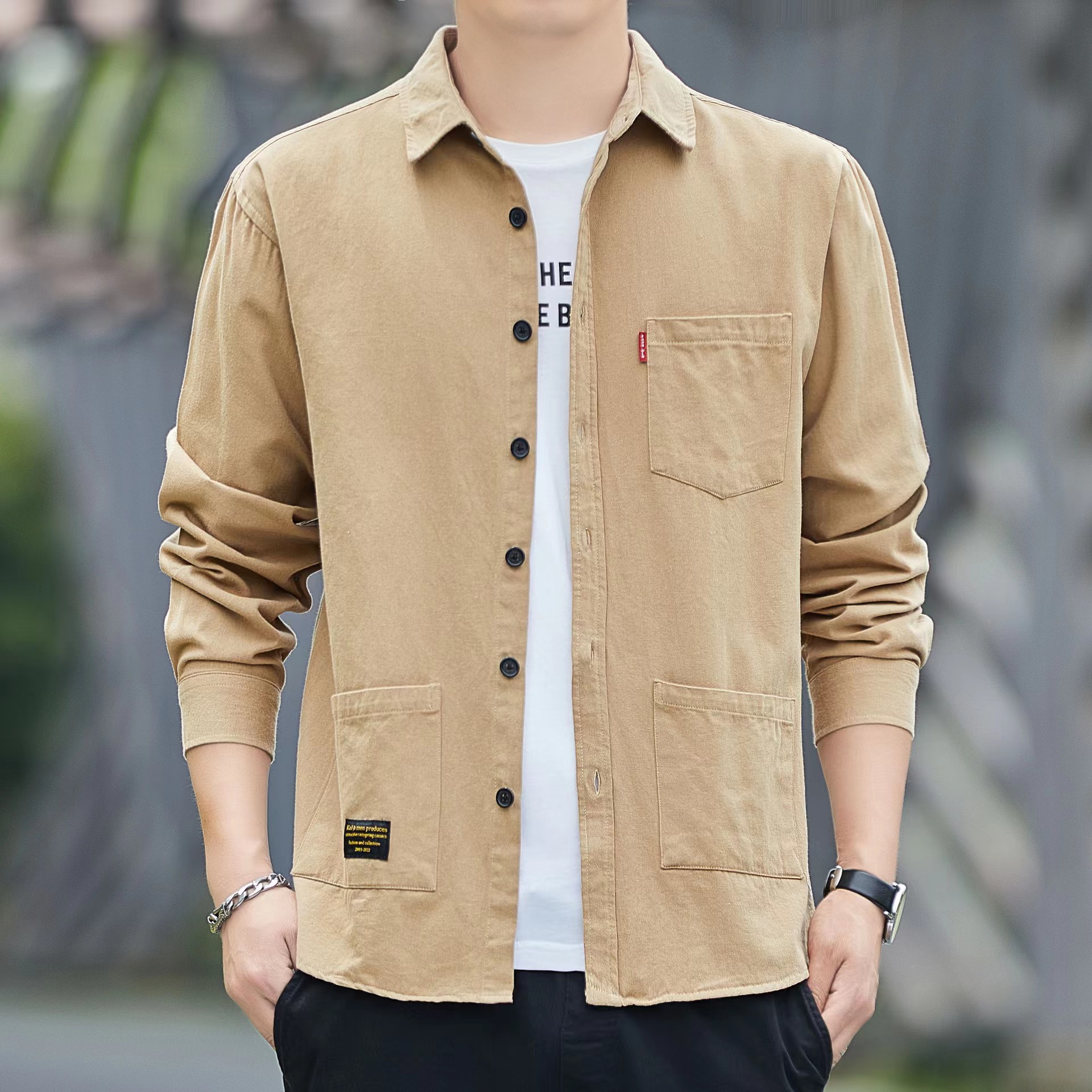 【两件装】纯棉工装长袖衬衫男士春秋季港风休闲全棉衬衣男装外套