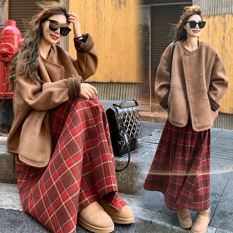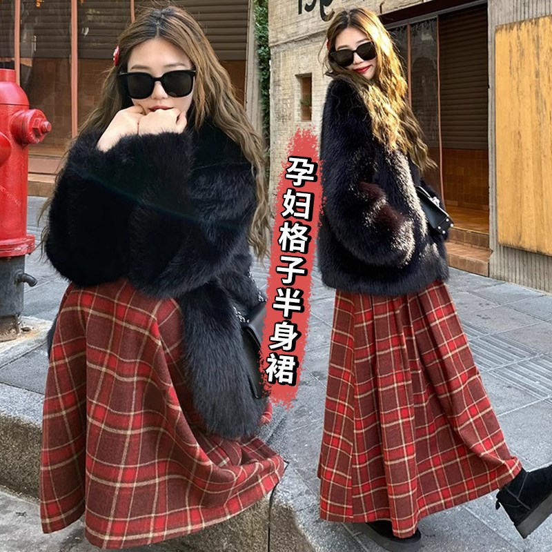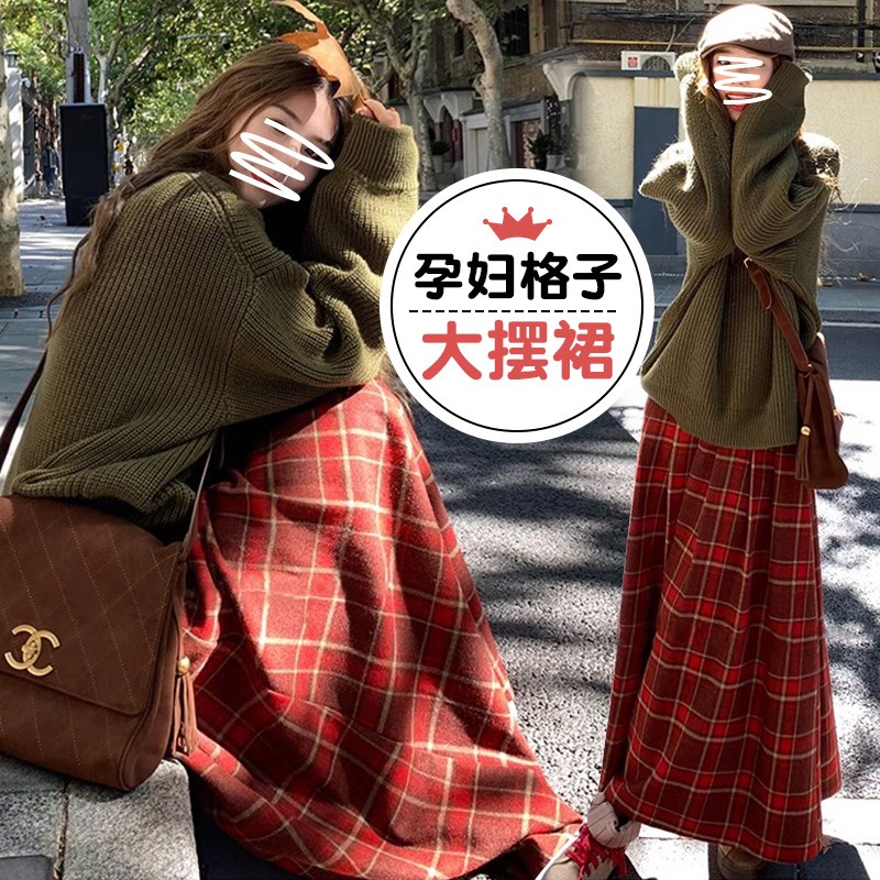 孕妇裙秋冬新款宽松运动红格子百褶针织毛M呢中长款流苏孕妇半身