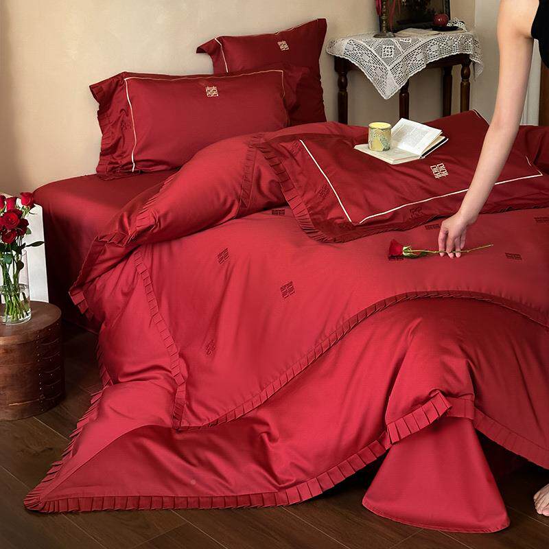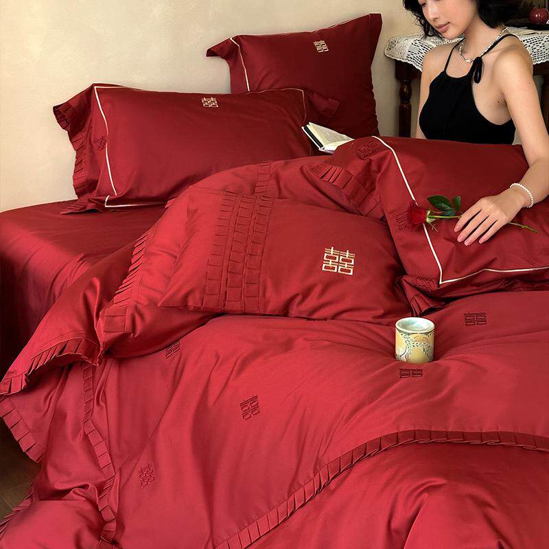 婚庆棉轻奢100套S长绒棉FS759025红四件套喜字刺绣色结婚被床单床