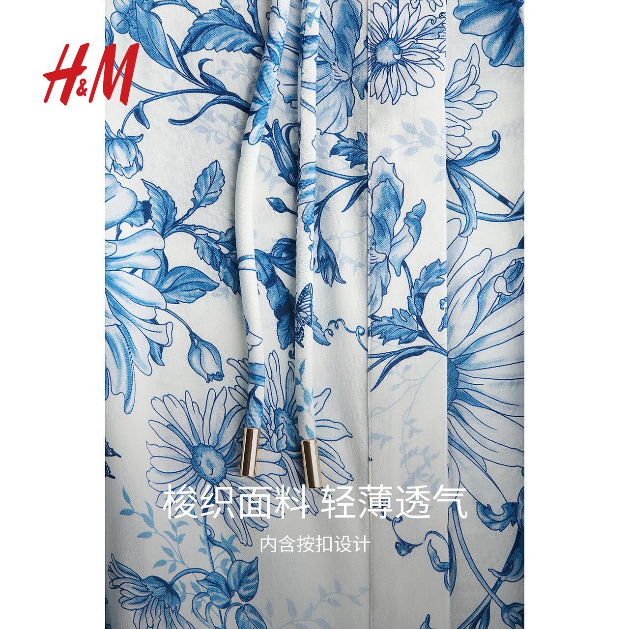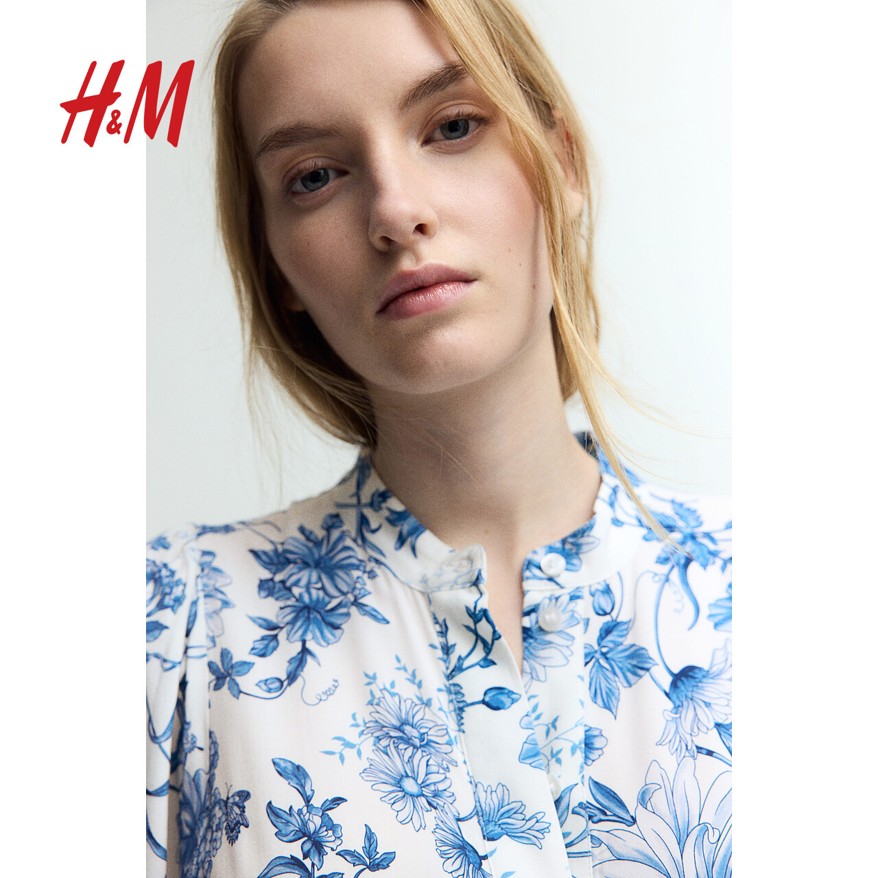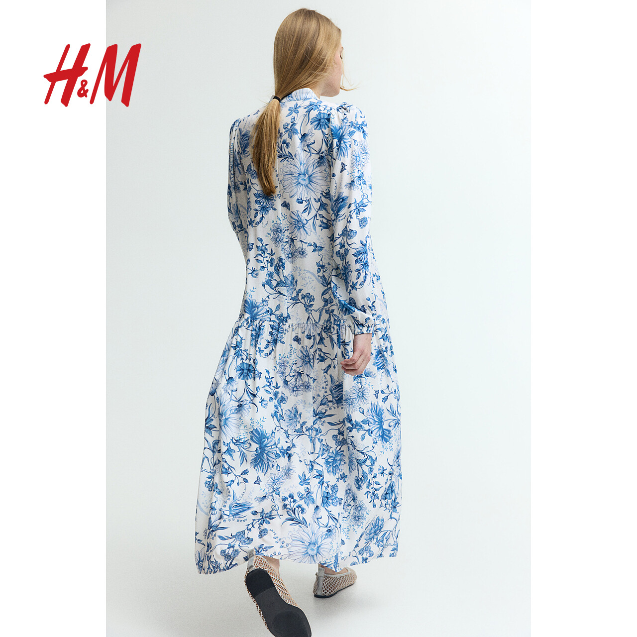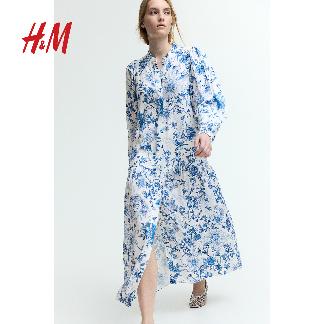 HM女装连衣裙2025秋季新款中式领泡泡袖收腰植物印花长裙1272213