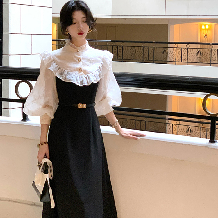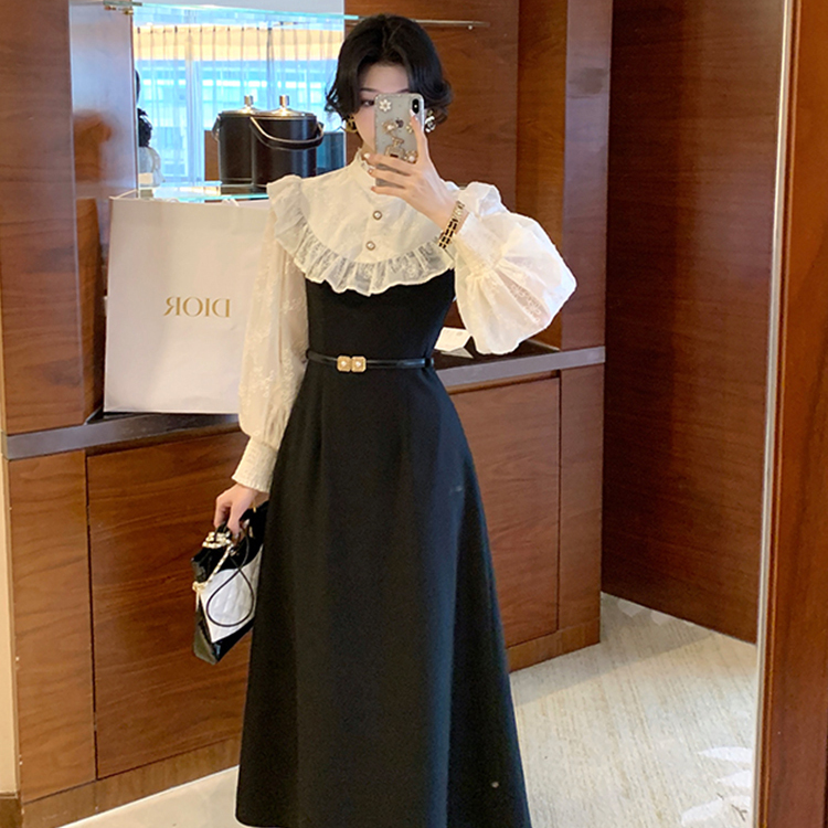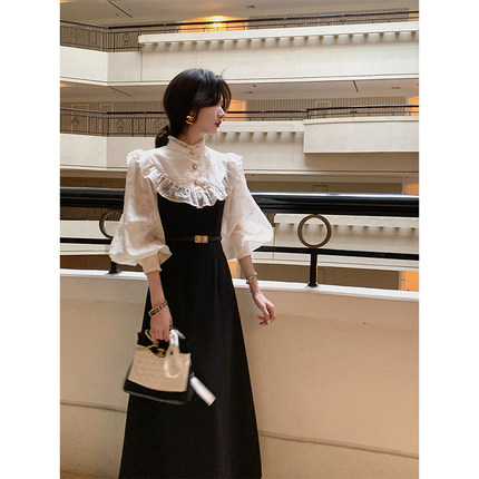 法式复古风黑白拼接蕾丝长袖连衣裙女早秋新款收腰显瘦气质长裙子
