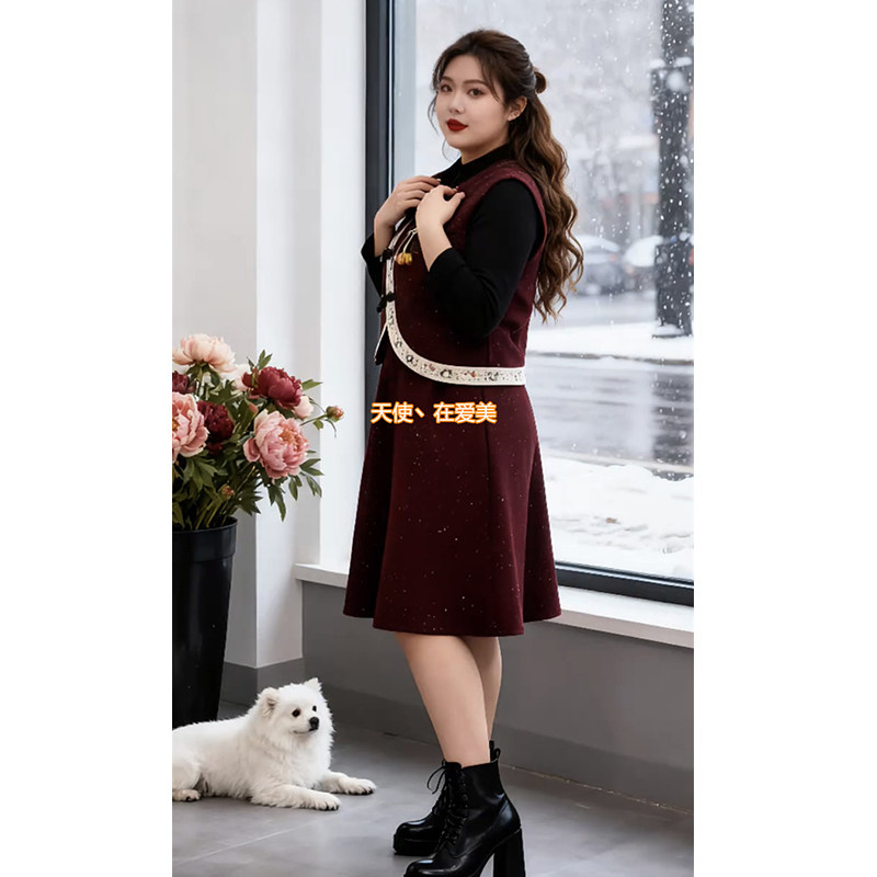 大码女装新款套装秋冬胖mm复古气质马甲时尚拼接显瘦连衣裙两件套