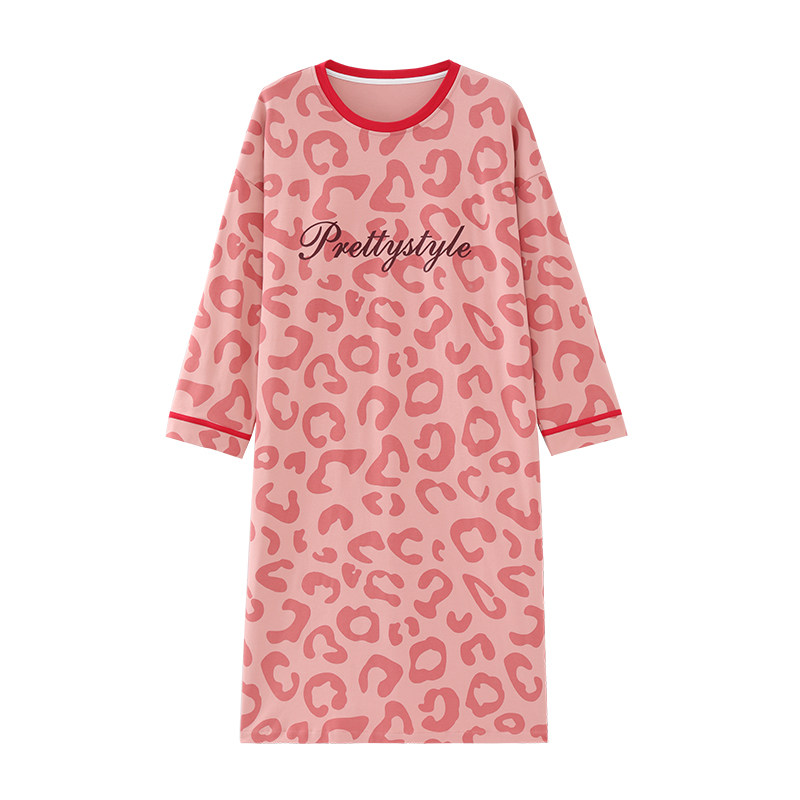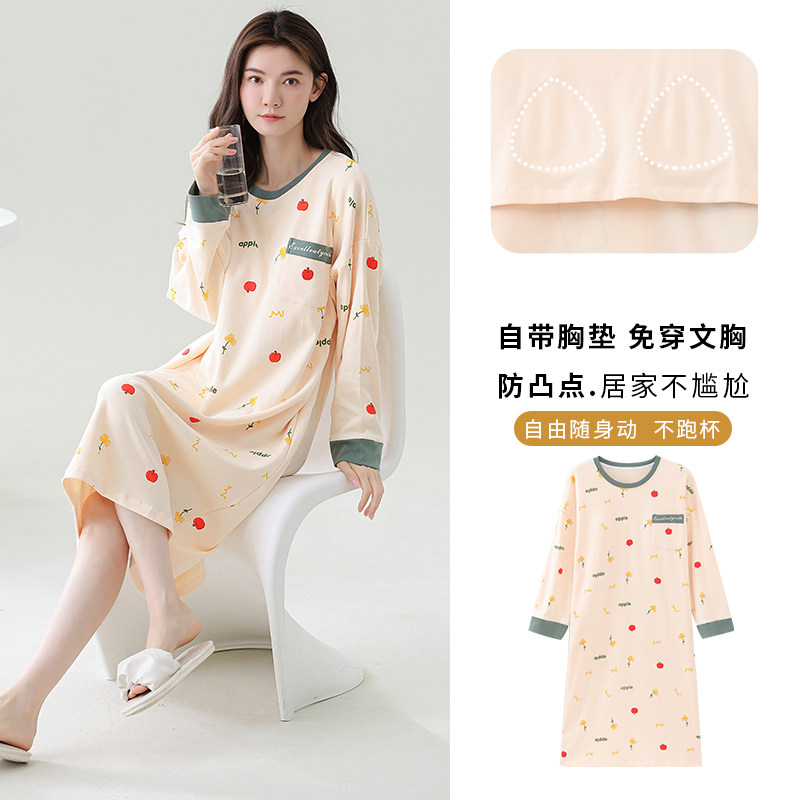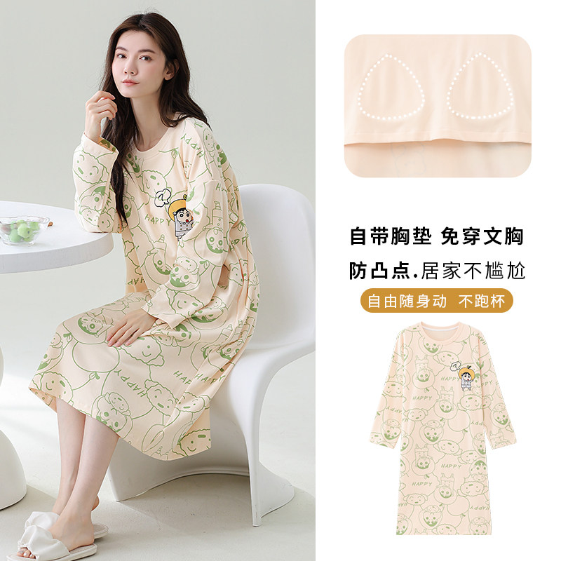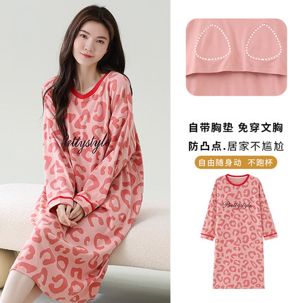 北极绒纯棉睡裙女春秋季长袖宽松加肥大码带胸垫一体睡衣连衣裙子