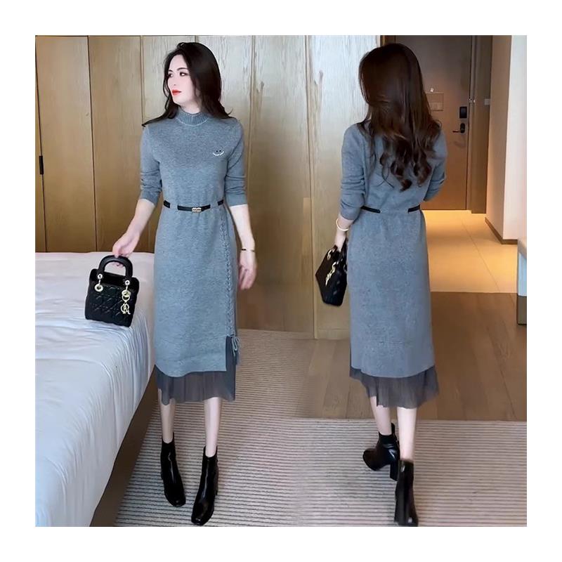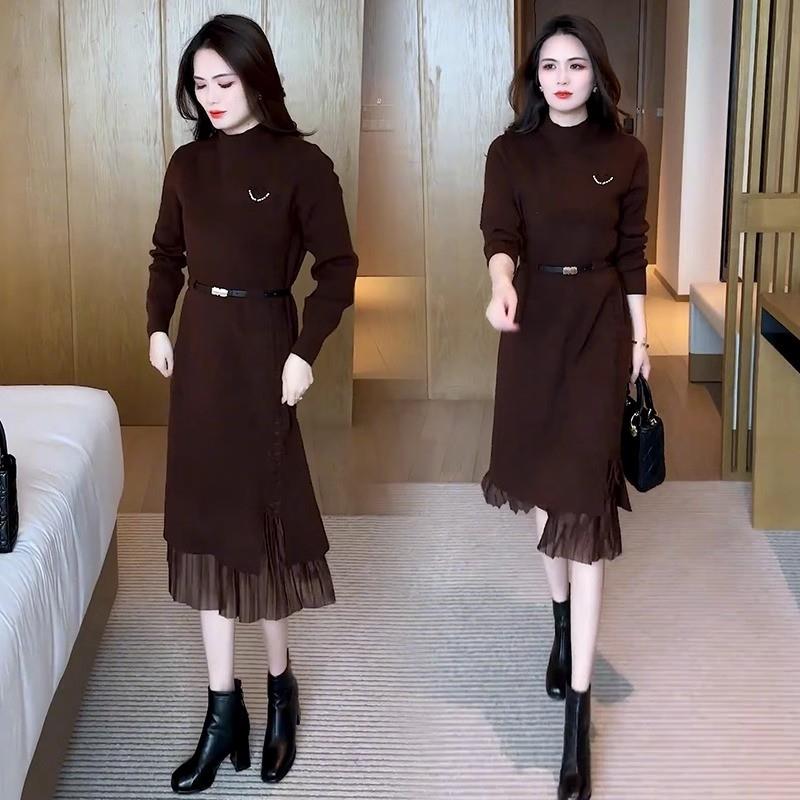 气质针织洋装女士2025年春秋冬季新款收腰中长版百搭毛衣打底裙