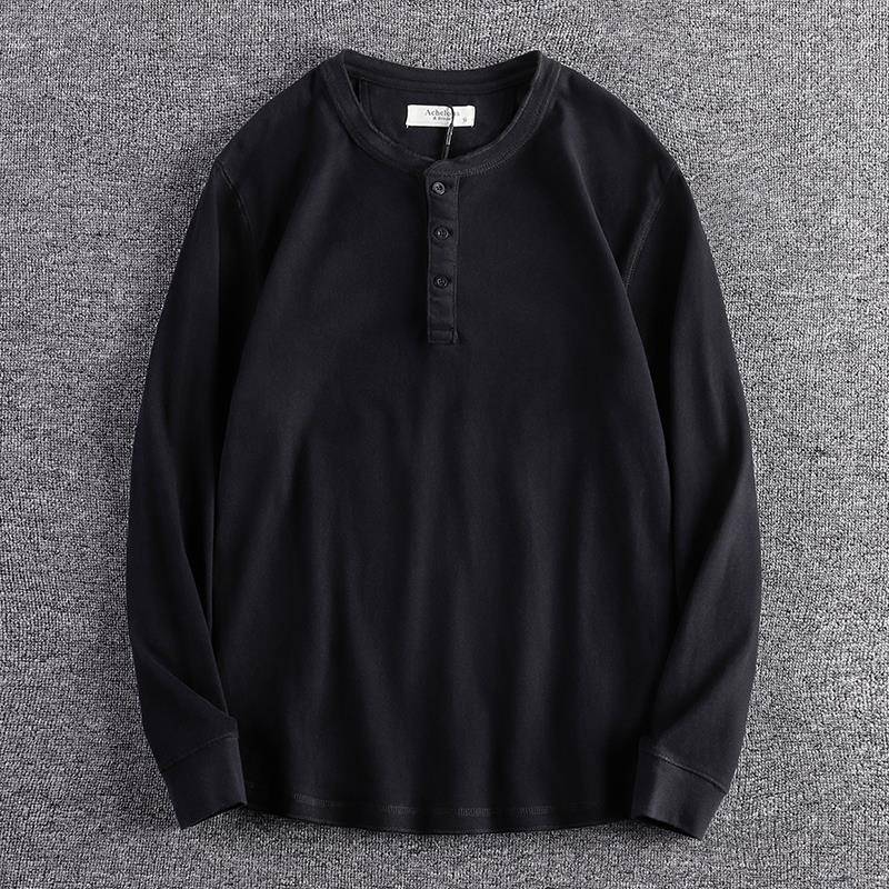 代购香港潮男春季美式重磅复古亨利领打底衫男士纯棉宽松长袖T恤