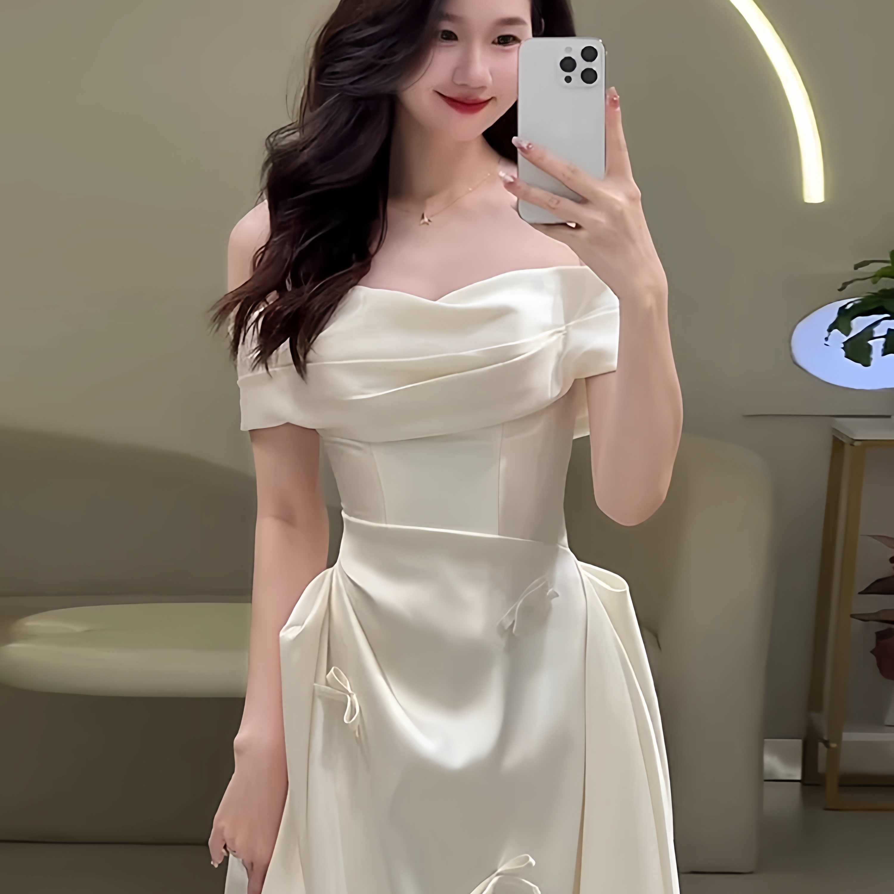 法式新娘缎面一字肩轻婚纱2025新款迎宾出门纱简约订结婚礼服134