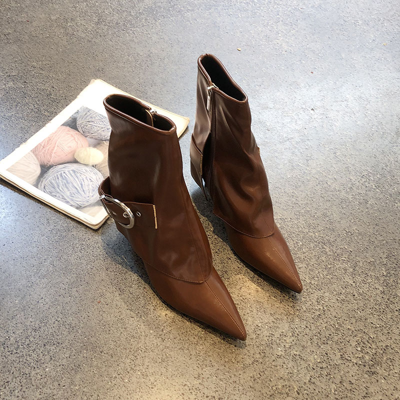 性感尖头高跟裤筒靴2025秋冬新款时尚皮带扣侧拉链显瘦细跟短靴女