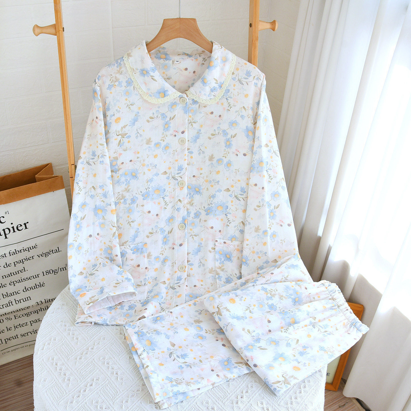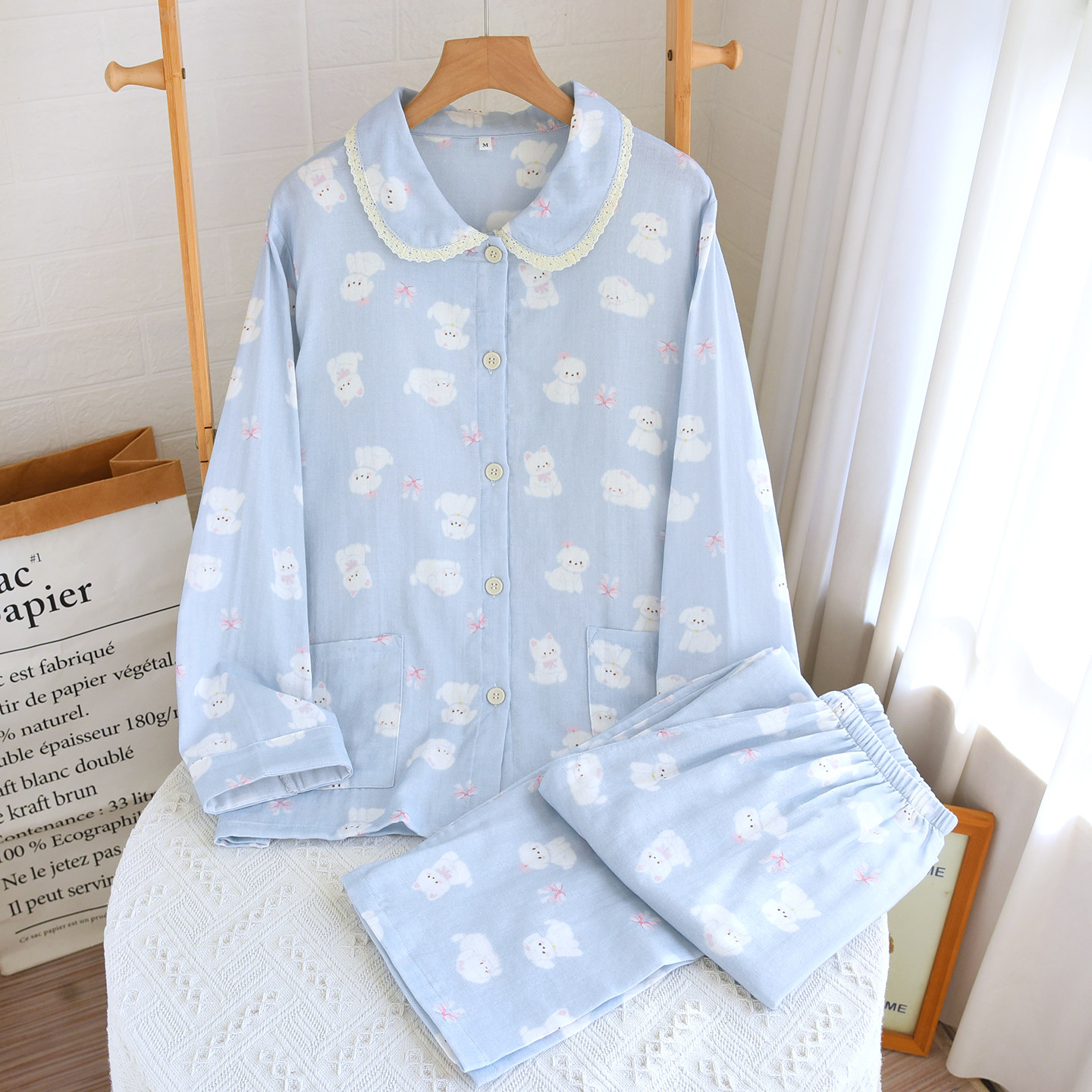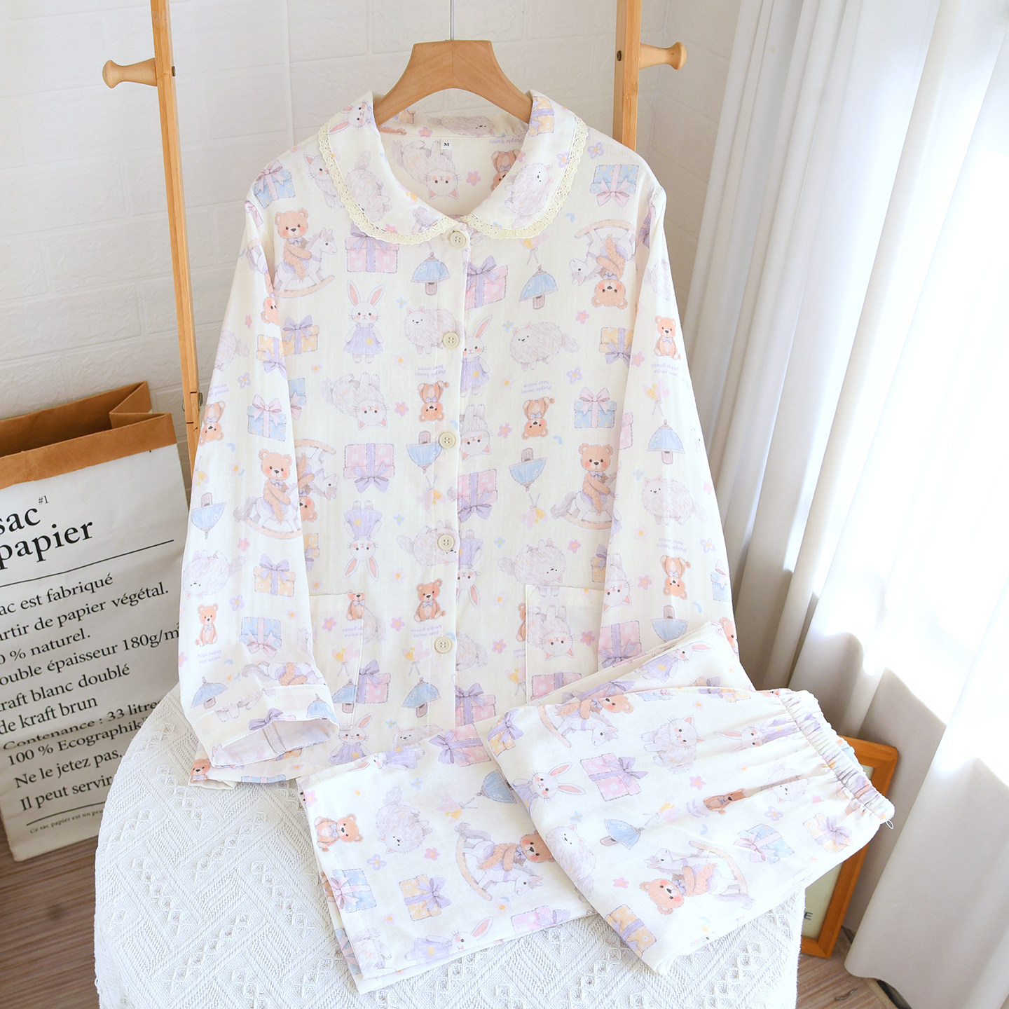 春夏秋纯棉纱布睡衣女长袖长裤卡通棉纱薄款家居服套装甜美可外穿