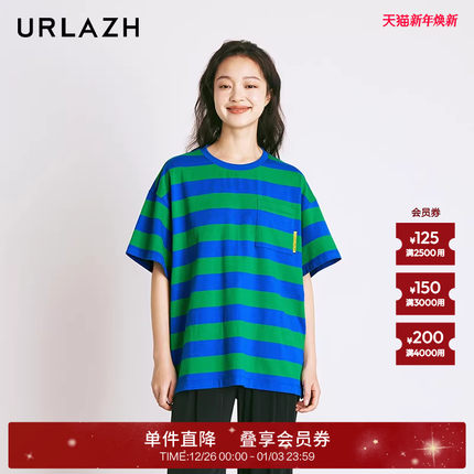 URLAZH有兰夏季新款复古时尚宽松休闲圆领条纹开叉下摆短袖T恤女