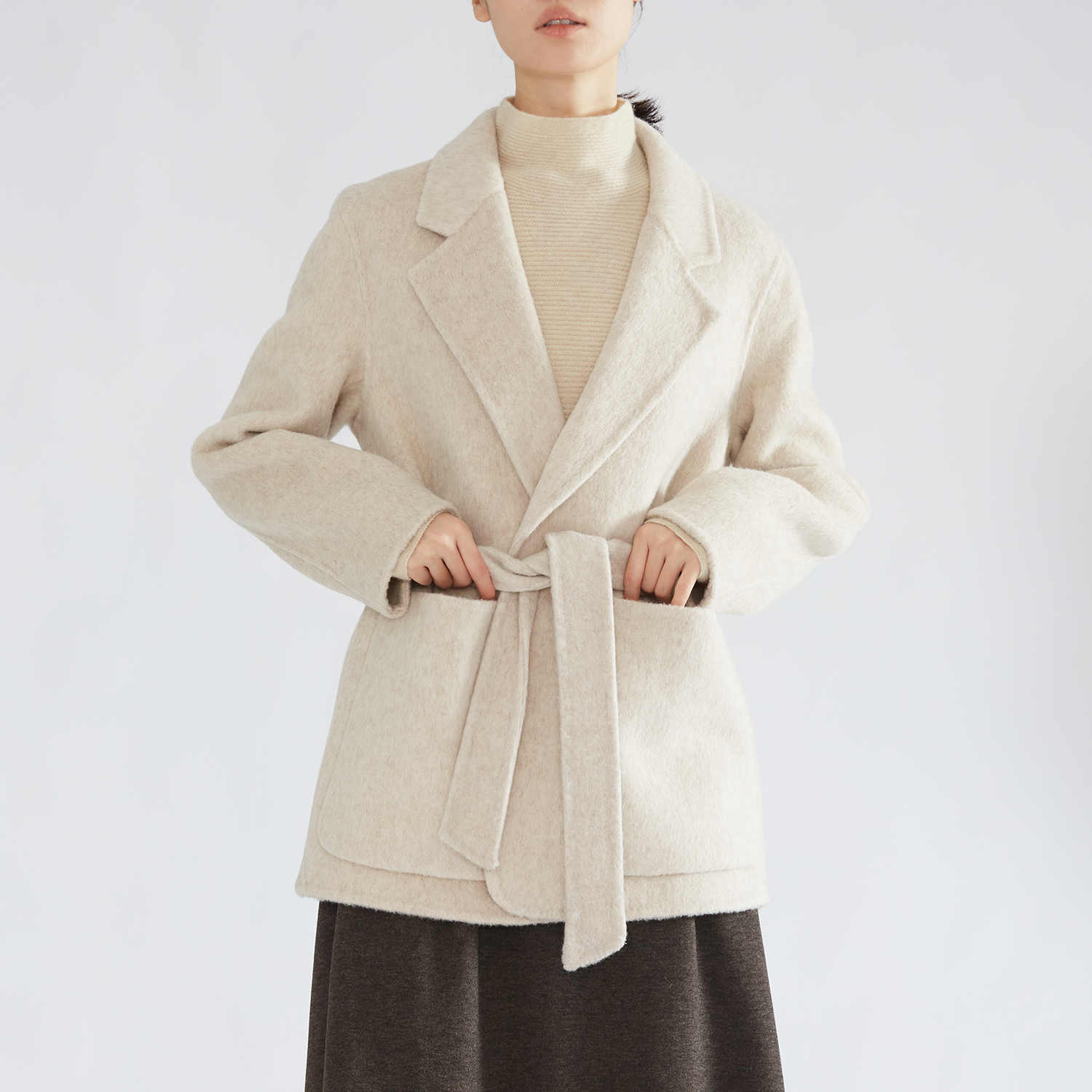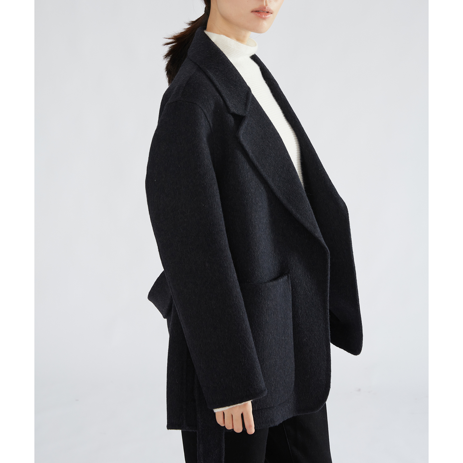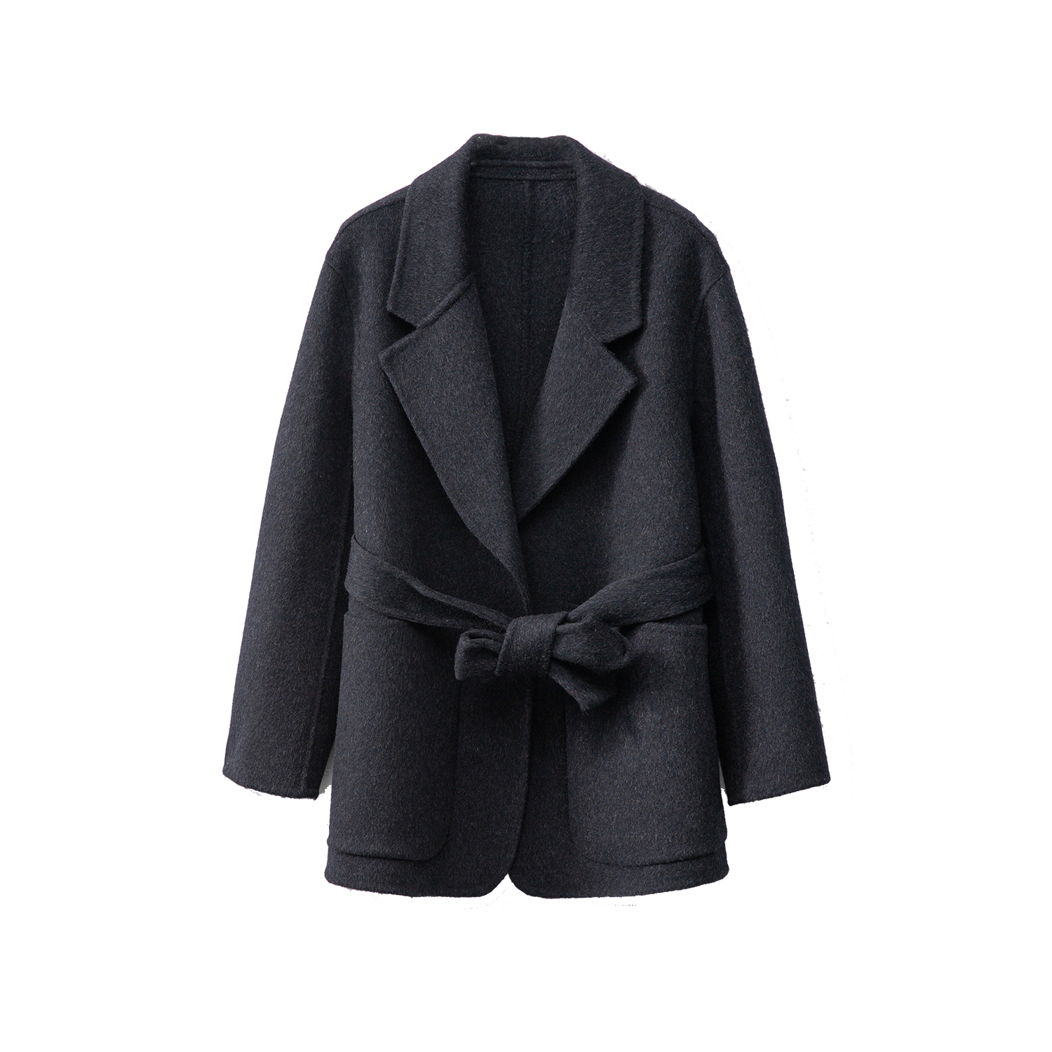 一丝牵 羊毛双面呢西装外套中长款纯色系带新款气质大衣冬新款