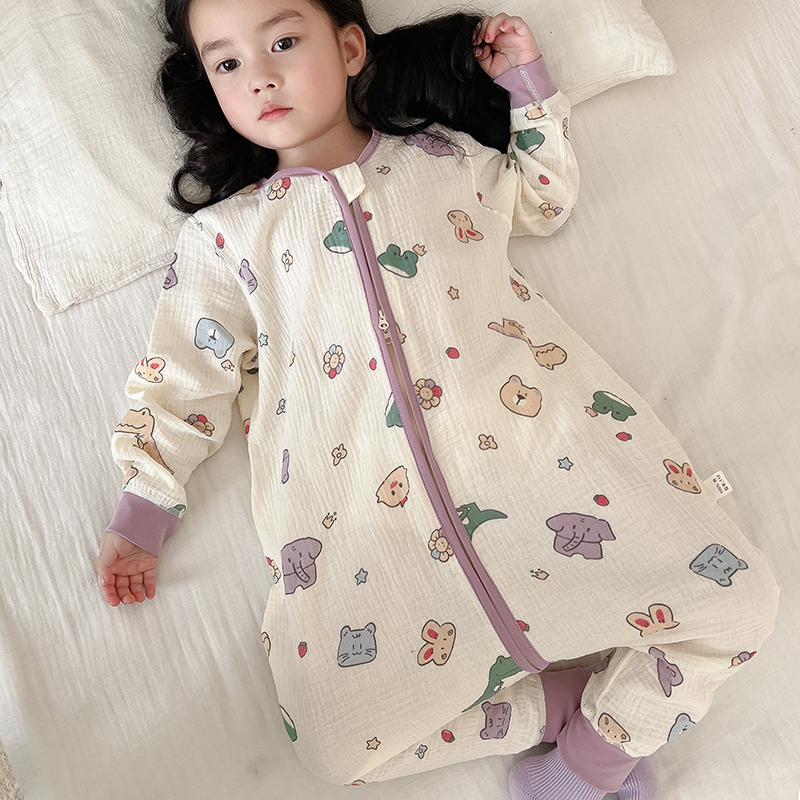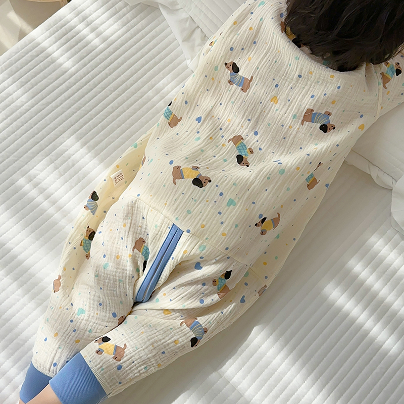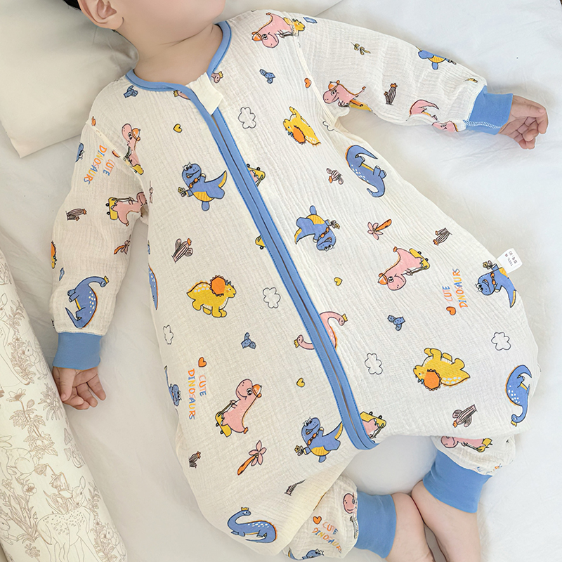夏季儿童长袖分腿睡袋宝宝防踢被纯棉睡衣男童女童双层纱布家居服