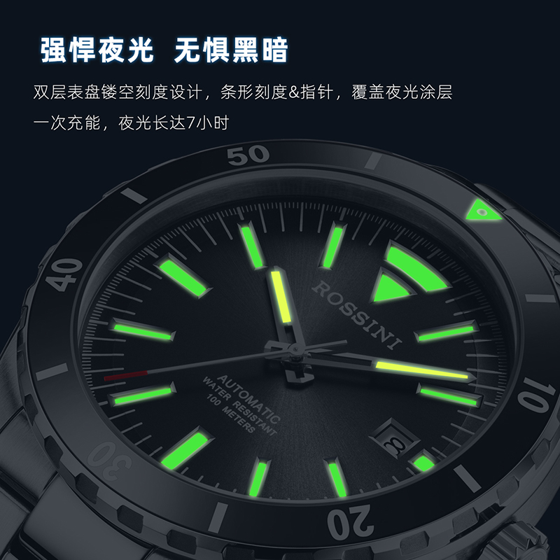 罗西尼官方旗舰店手表男自动机械表100米防水夜光潜水男表50069