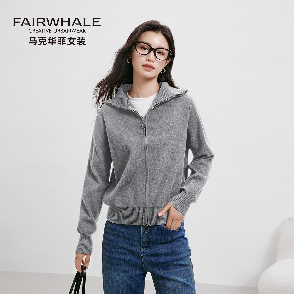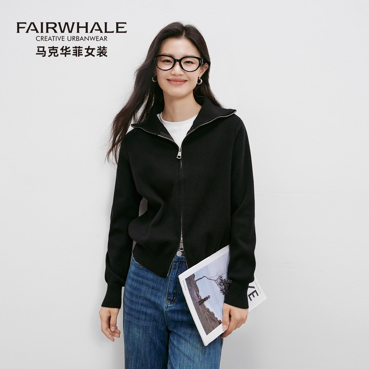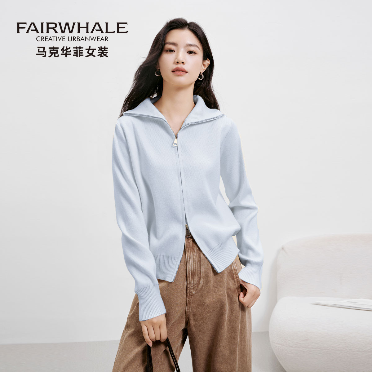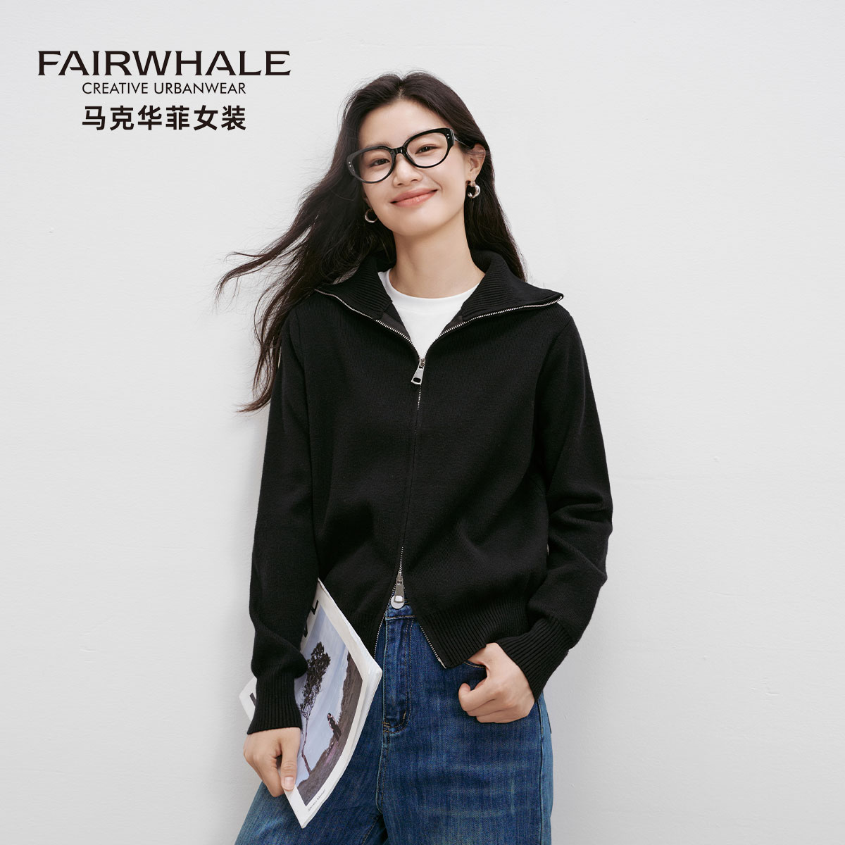 马克华菲双拉链大翻领针织开衫外套女2025新款超好看慵懒气质毛衣