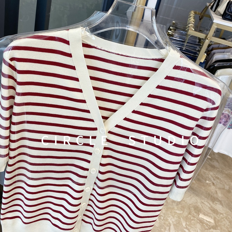 法式通勤 夏季新款时髦红白条纹薄款纯棉短袖针织衫女V领修身开衫