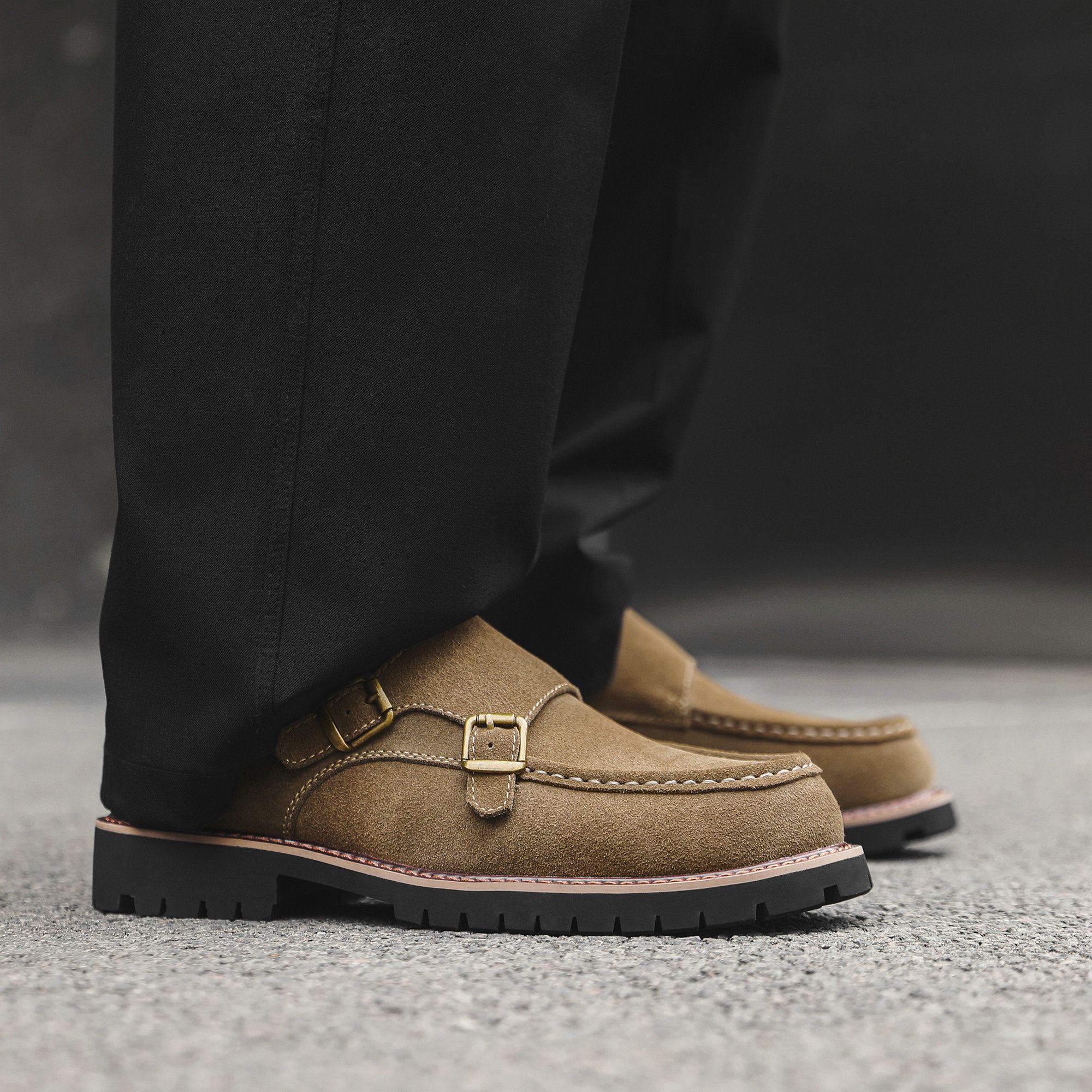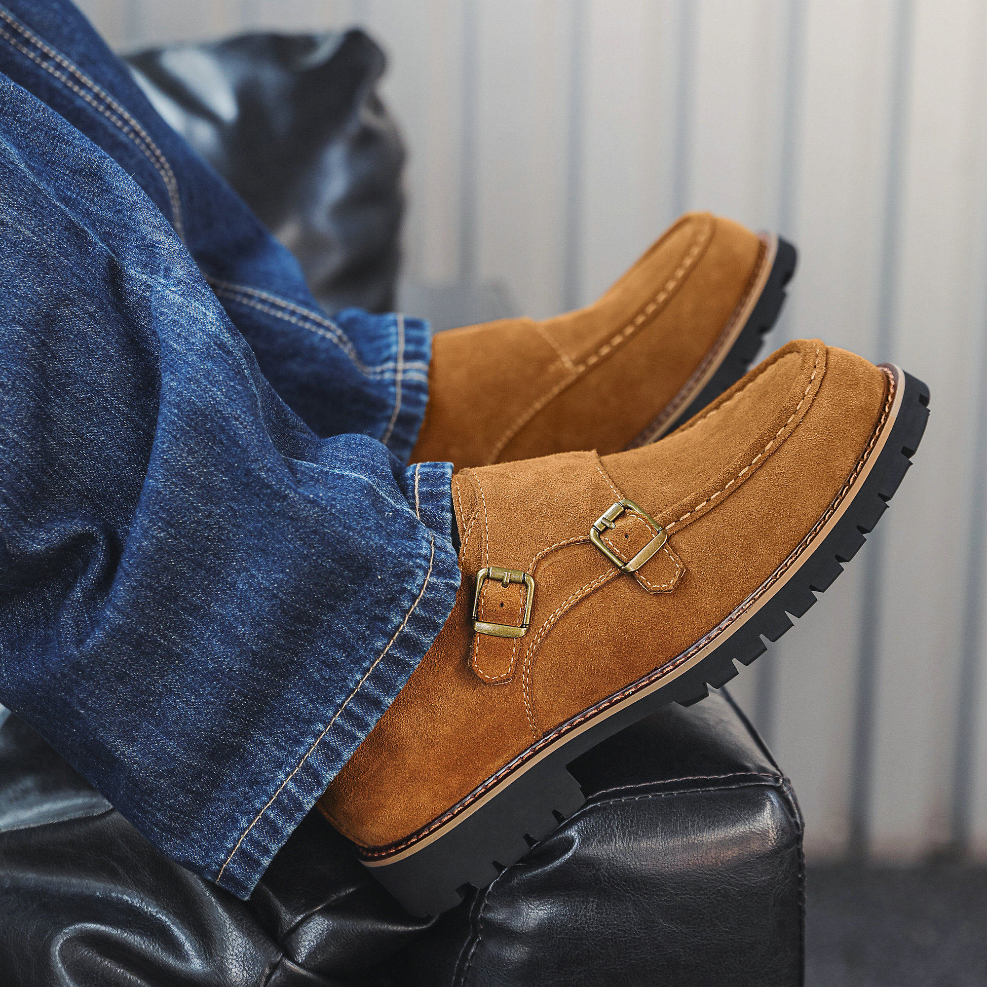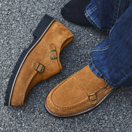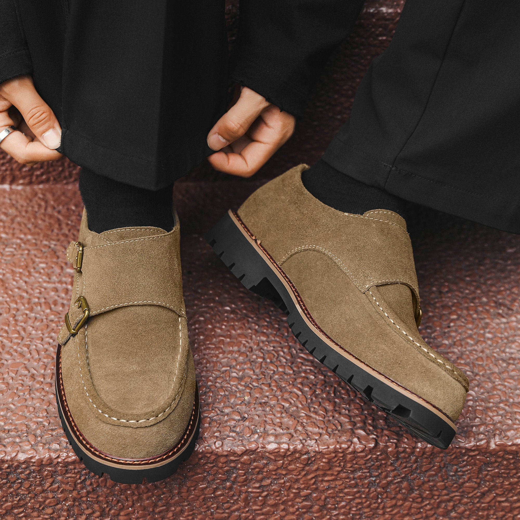 男士皮鞋复古孟克鞋磨砂翻毛棕色英伦风僧侣鞋休闲美式德比鞋真皮