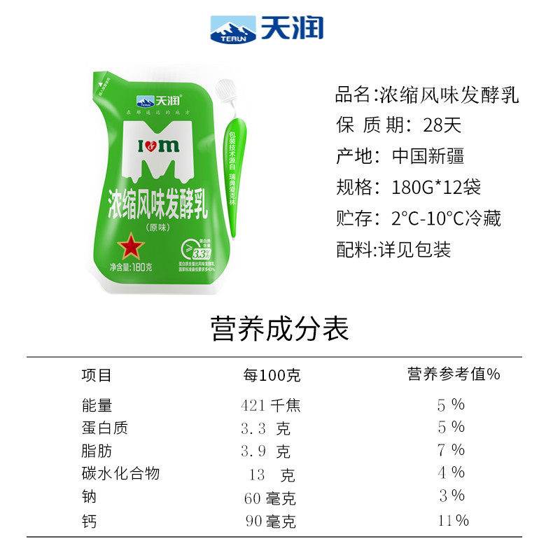 【次日达】天润全脂浓缩酸奶新疆牛奶低温原味风味发酵乳180g12袋
