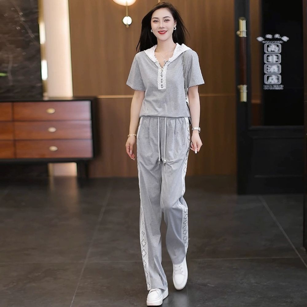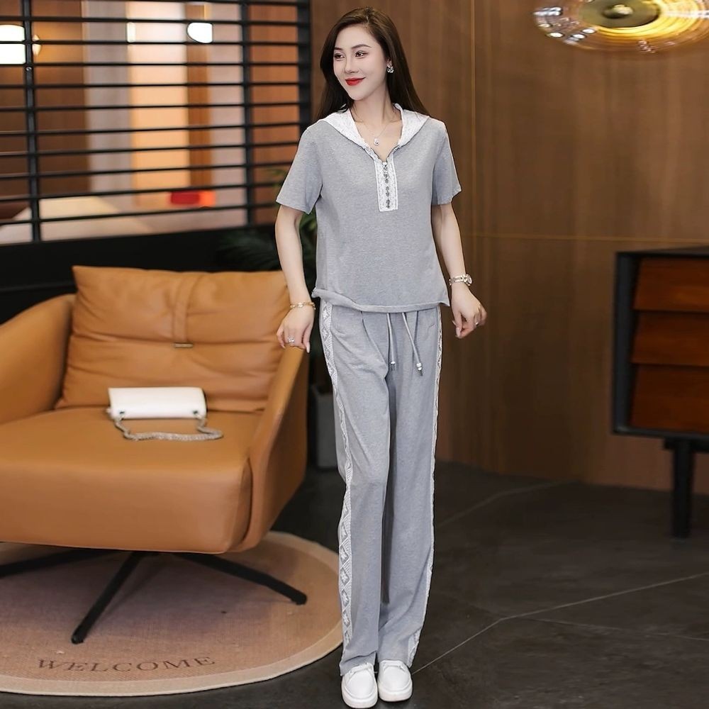 时尚休闲套装女夏季新款减龄显瘦连帽蕾丝短袖上衣阔腿裤两件套女