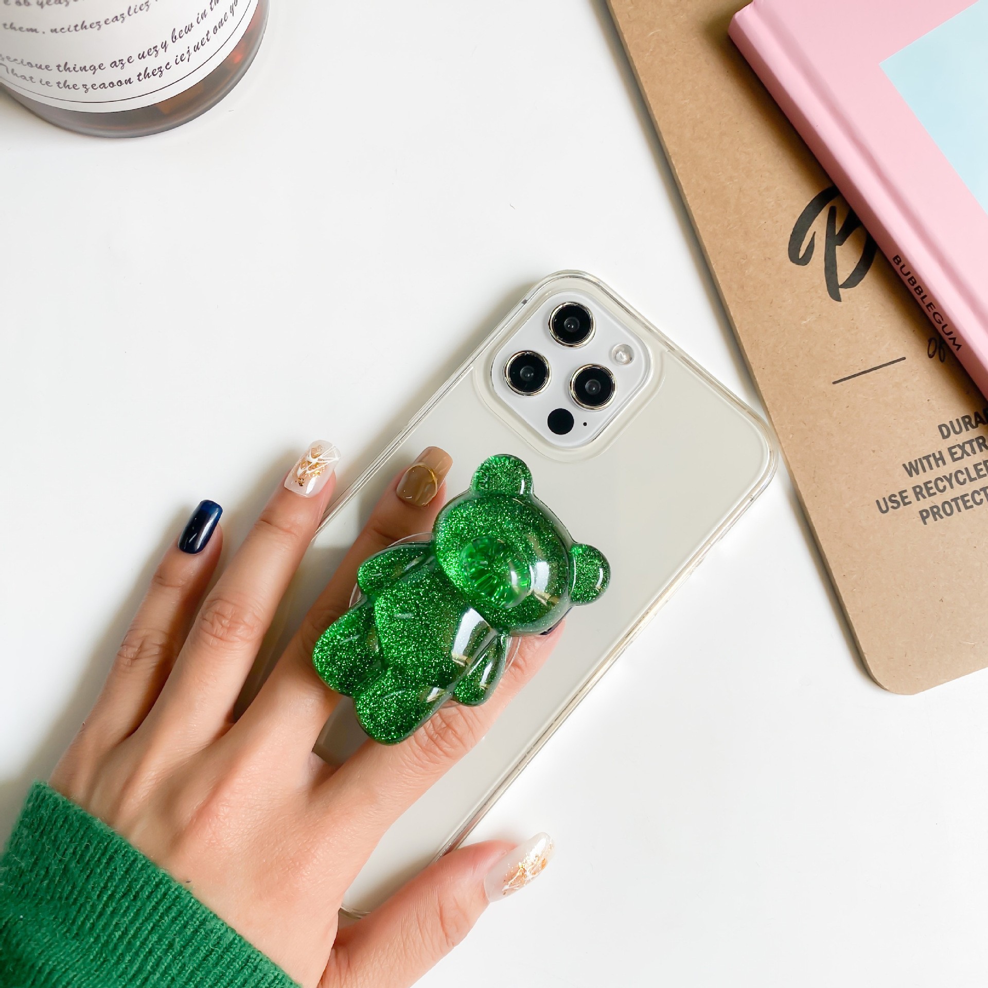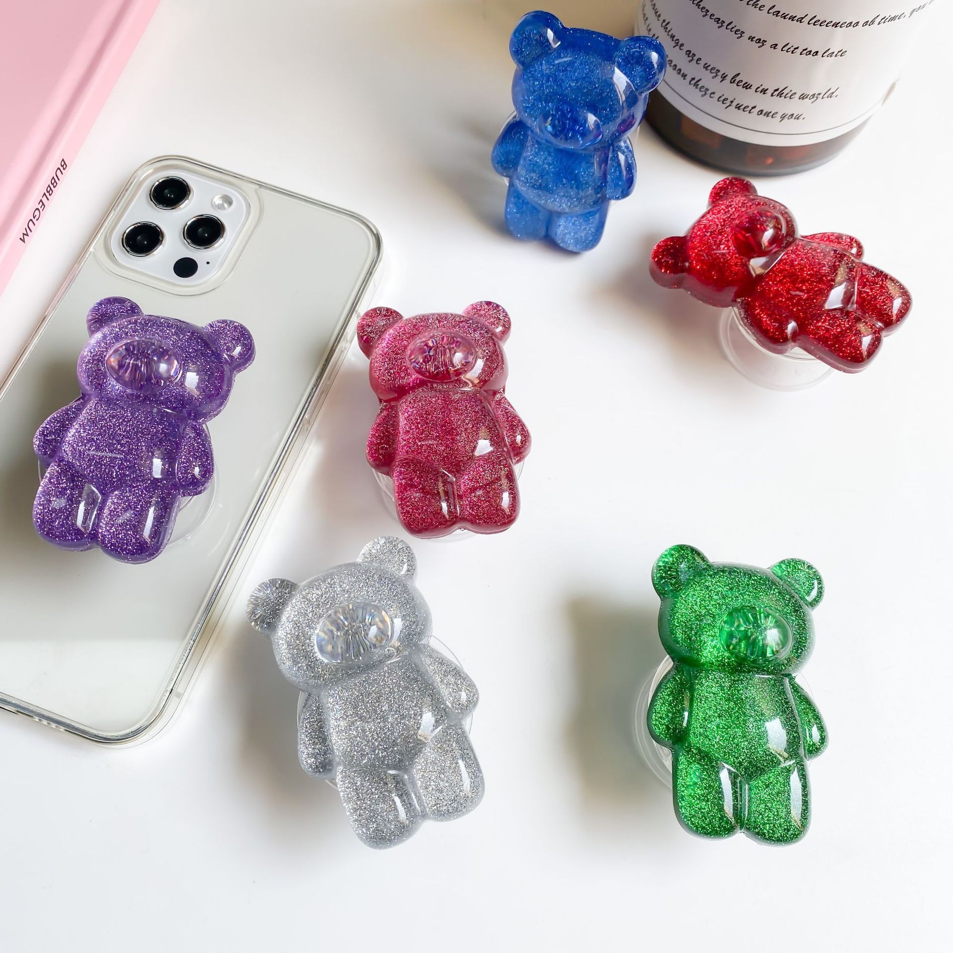 气囊气垫支架创意简约小熊可爱可日粘贴手机闪粉伸缩桌面式韩卡通