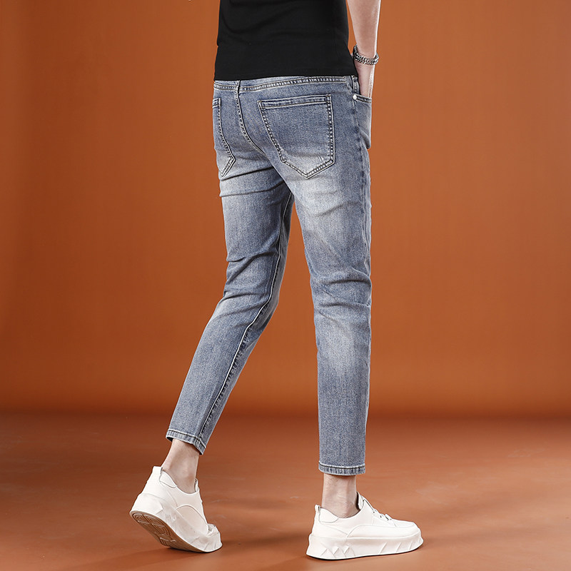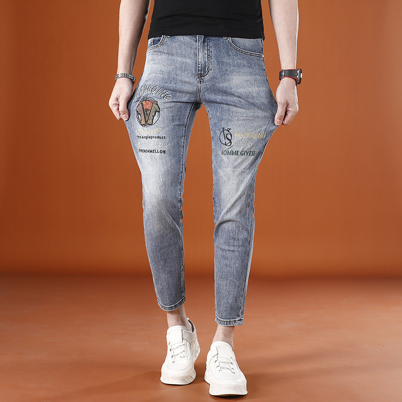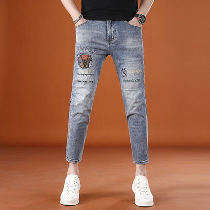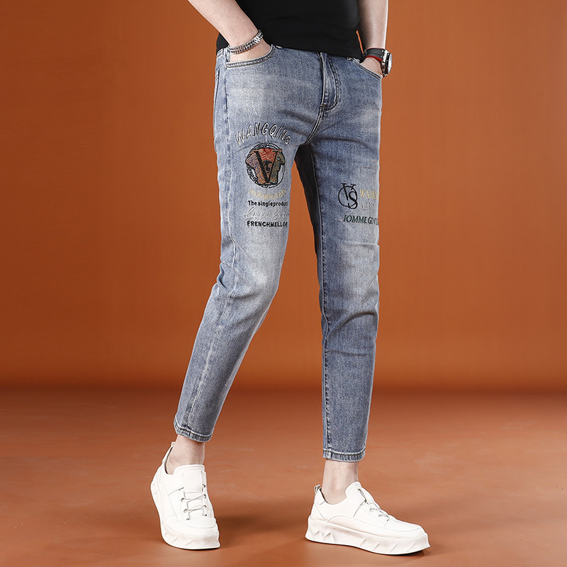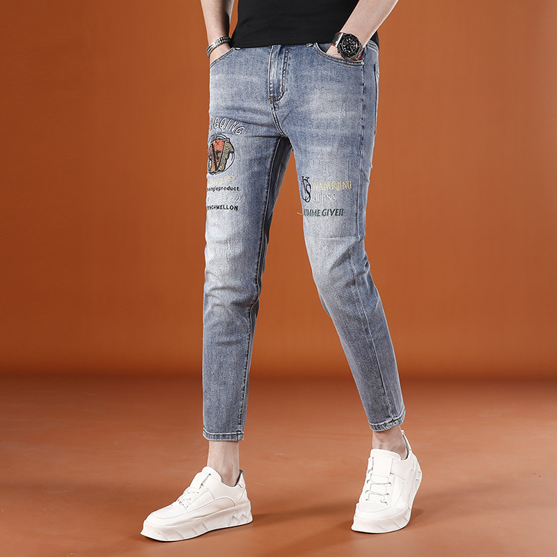 浅蓝色九分裤男牛仔裤夏季薄款潮男时尚刺绣男士9分裤修身小脚裤