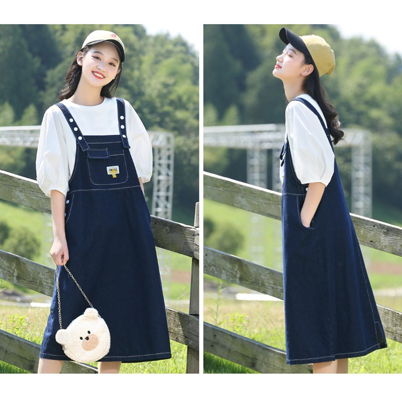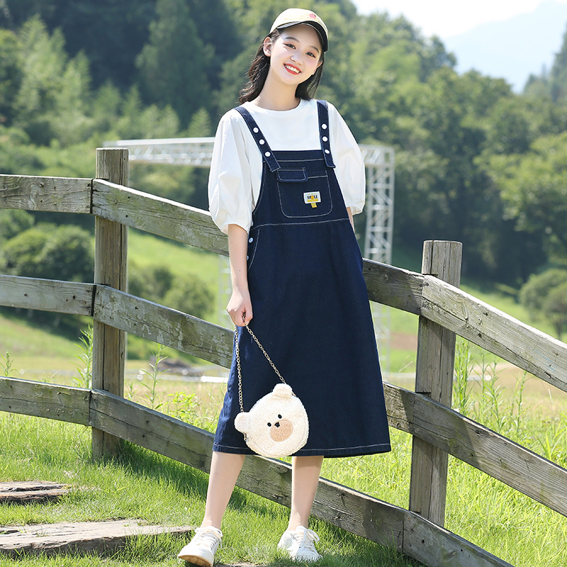 漂亮连衣裙初中学生牛仔背带裙套装五分袖T恤两件套高中生胖女孩