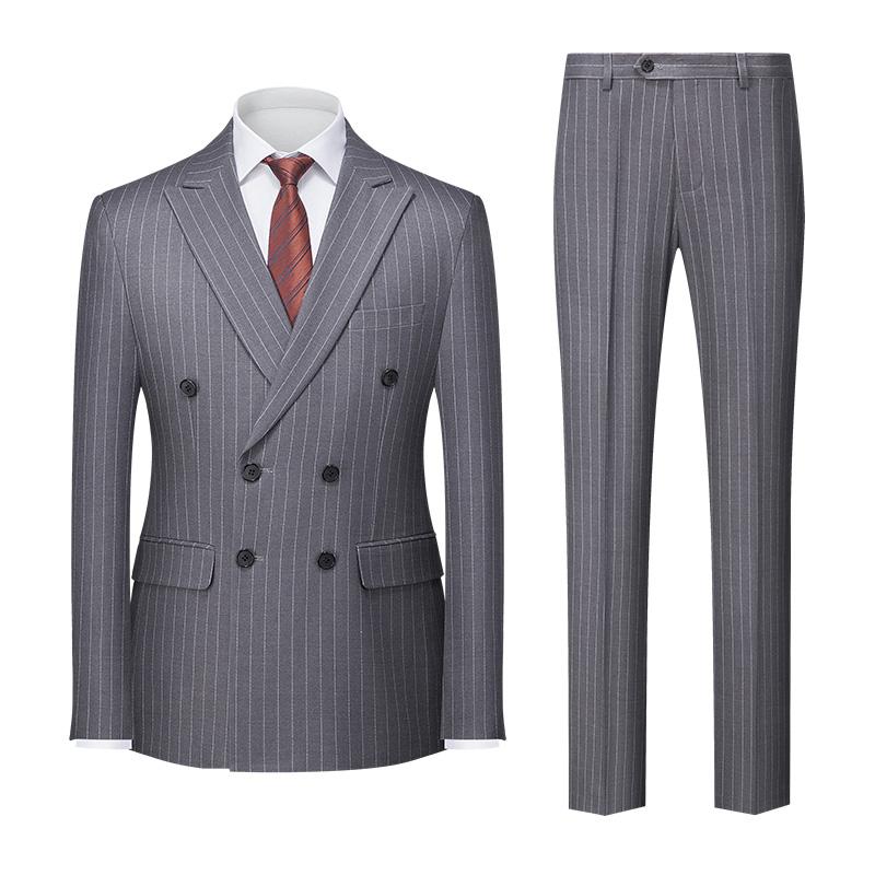 男士商务休闲时尚条纹双排扣西装套装修身新郎结婚礼服西服两件套