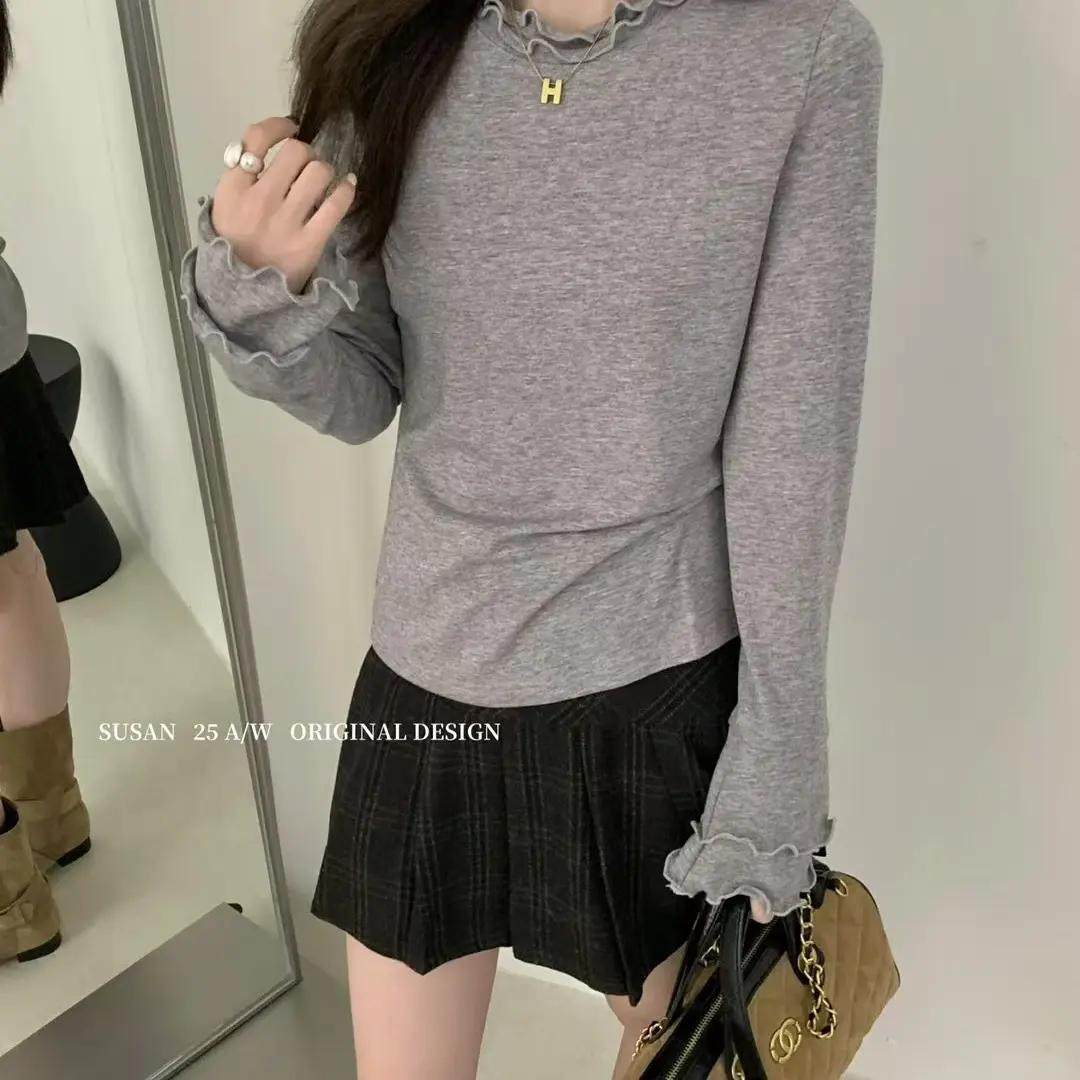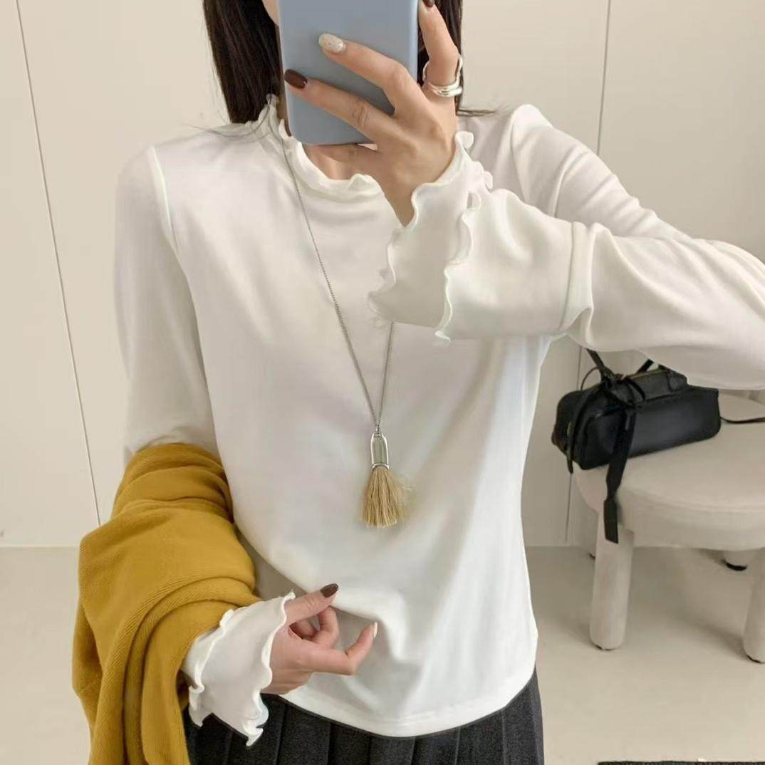 大码女装设计款秋冬气质甜美双木耳边长袖立领T恤加厚打底衫上衣