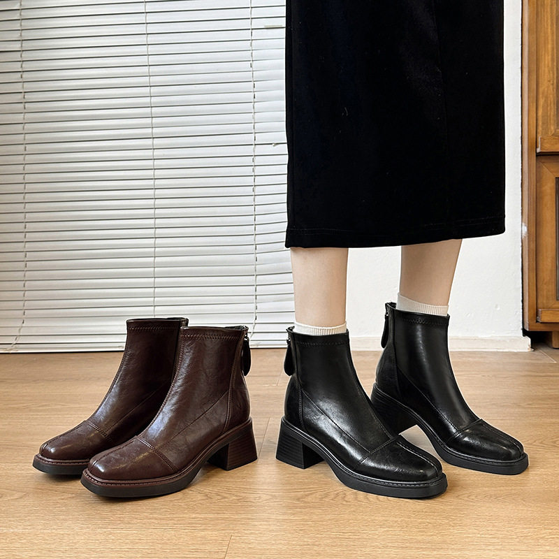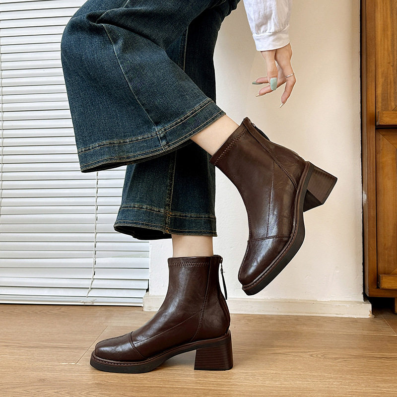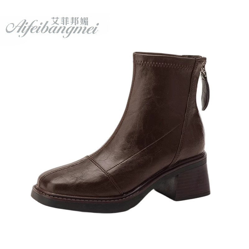 高跟方头短靴棕色马丁靴冬季加绒瘦瘦靴真皮弹力女靴洋气粗跟靴子