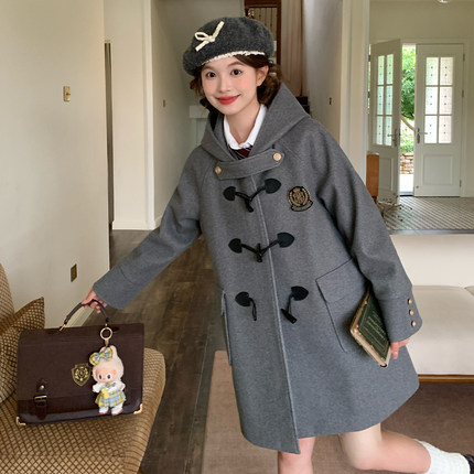 东京岁时记jk秋冬新款牛角扣连帽大衣灰色中长款毛呢外套莱克学院