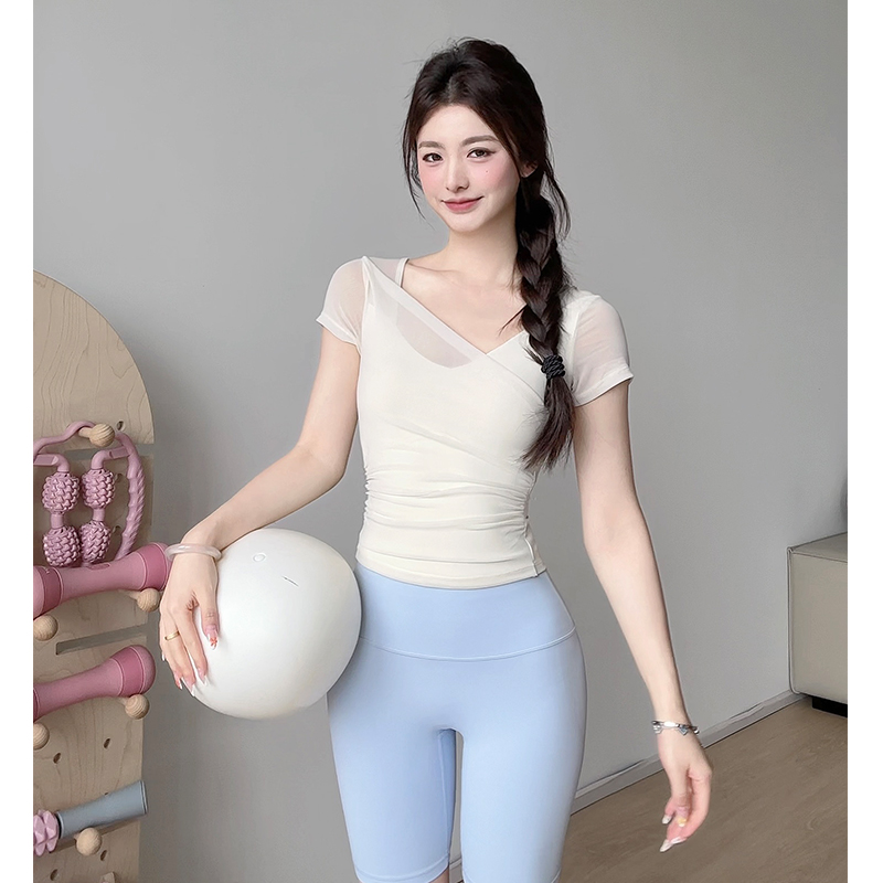 gogoyoga瑜伽短袖交叉褶皱V领上衣固定杯镂空美背短款速干运动T恤