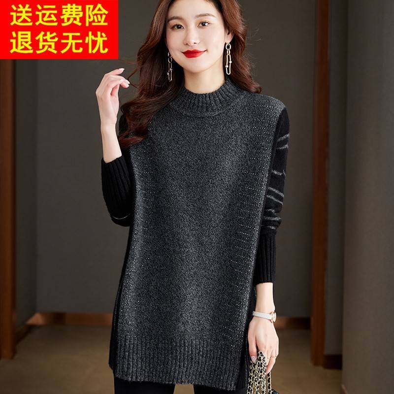 半高领黑灰色毛衣女秋冬中长款打底衫毛衣裙羊毛衫宽松大码蝙蝠衫