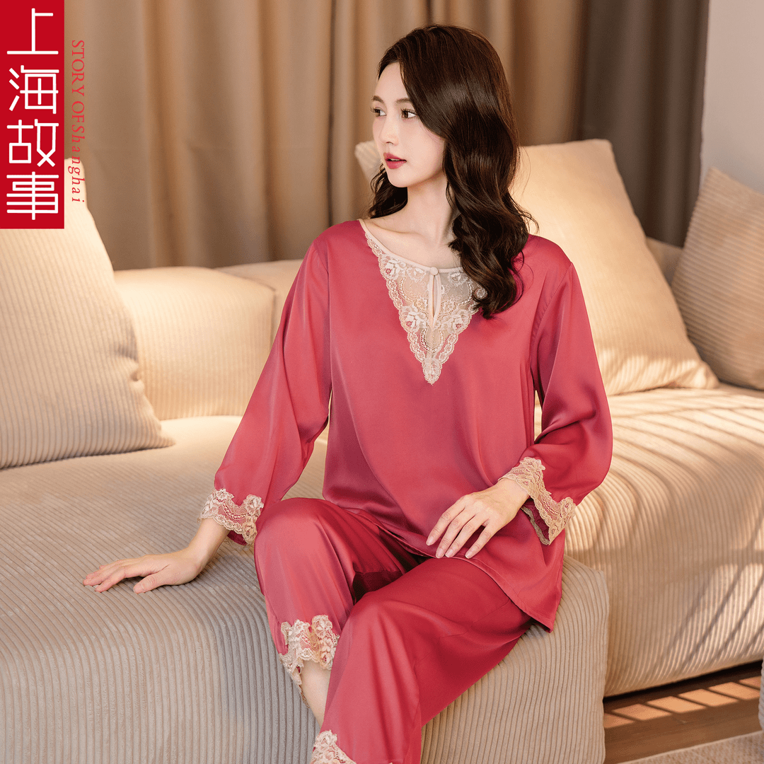 达芬奇密真丝睡衣女夏季七分袖薄款春秋性感蕾丝冰丝两件套居家服