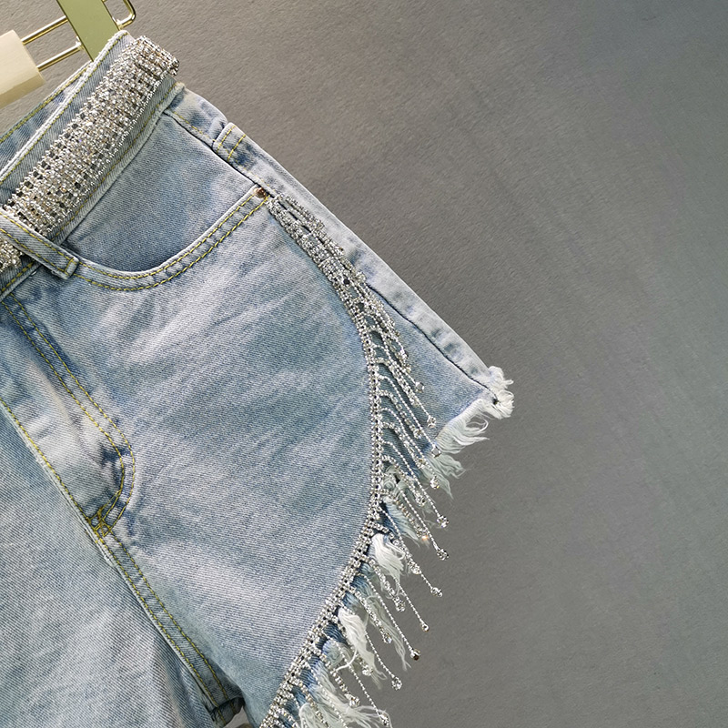 薄牛仔短裤女潮2025夏季新款欧洲站修身显瘦重工水钻流苏毛边热裤