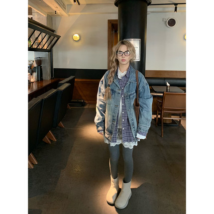荒荒家 经典牛仔加绒外套2025秋冬新款减龄宽松bf港风夹克衬衫女