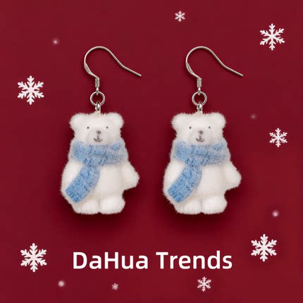 可爱植绒蓝色北极熊 精致毛绒甜美萌趣百搭女款耳饰耳环 无洞耳夹