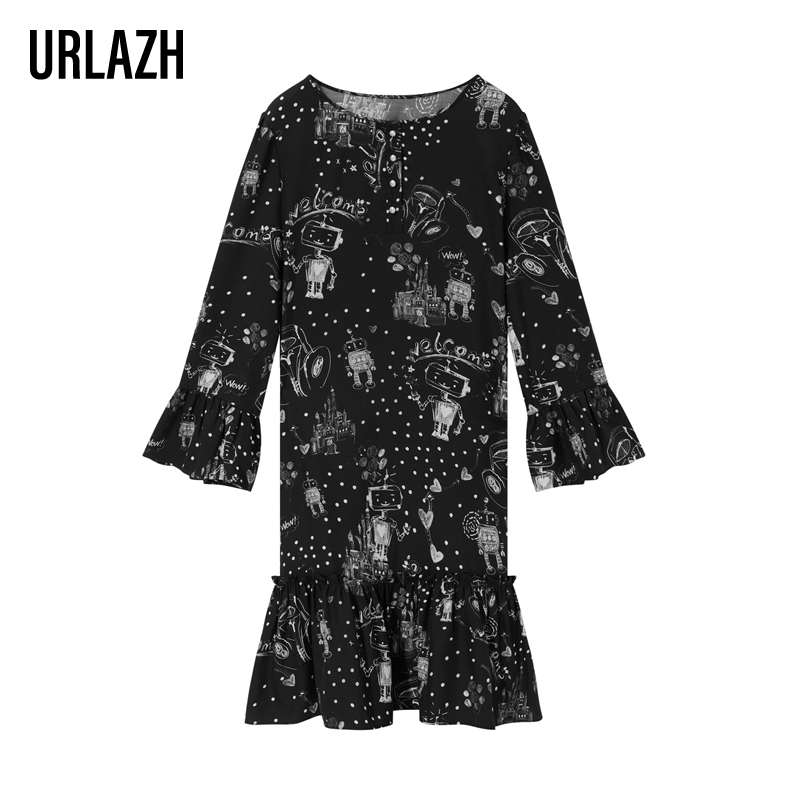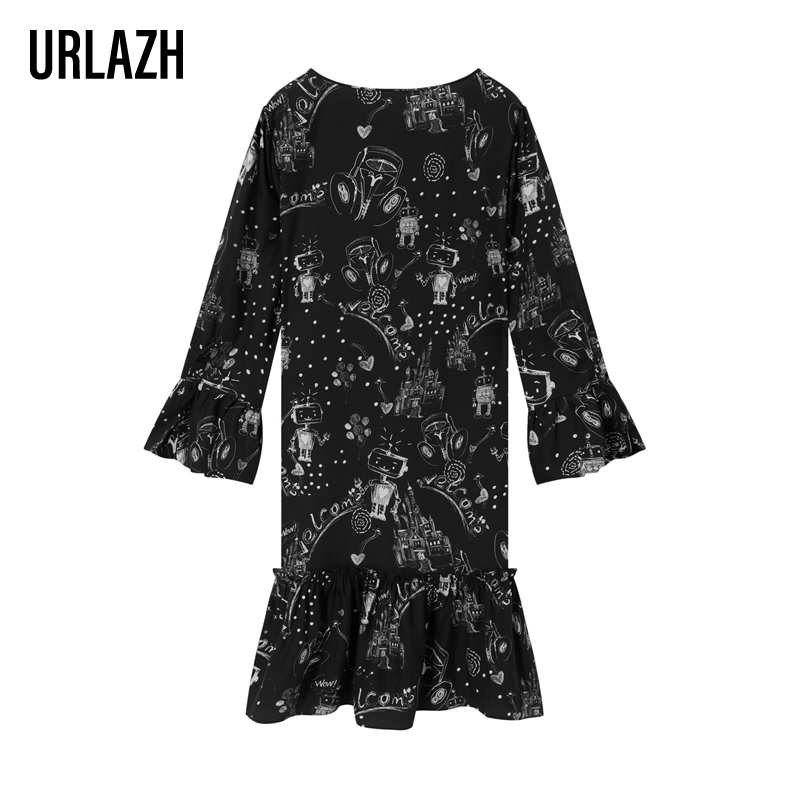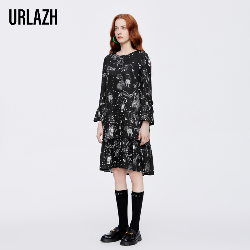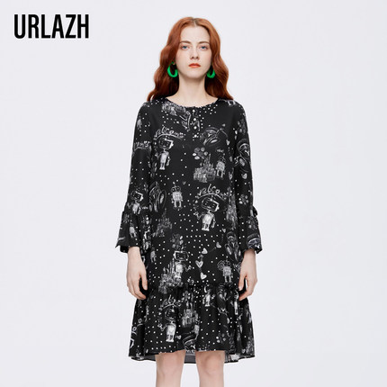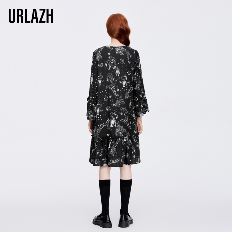URLAZH有兰夏季新款黑色时髦潮流印花宽松娃娃气质长袖连衣裙