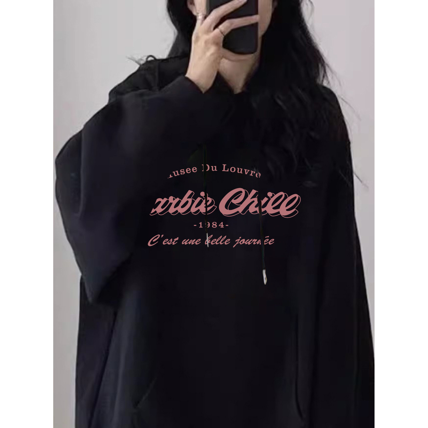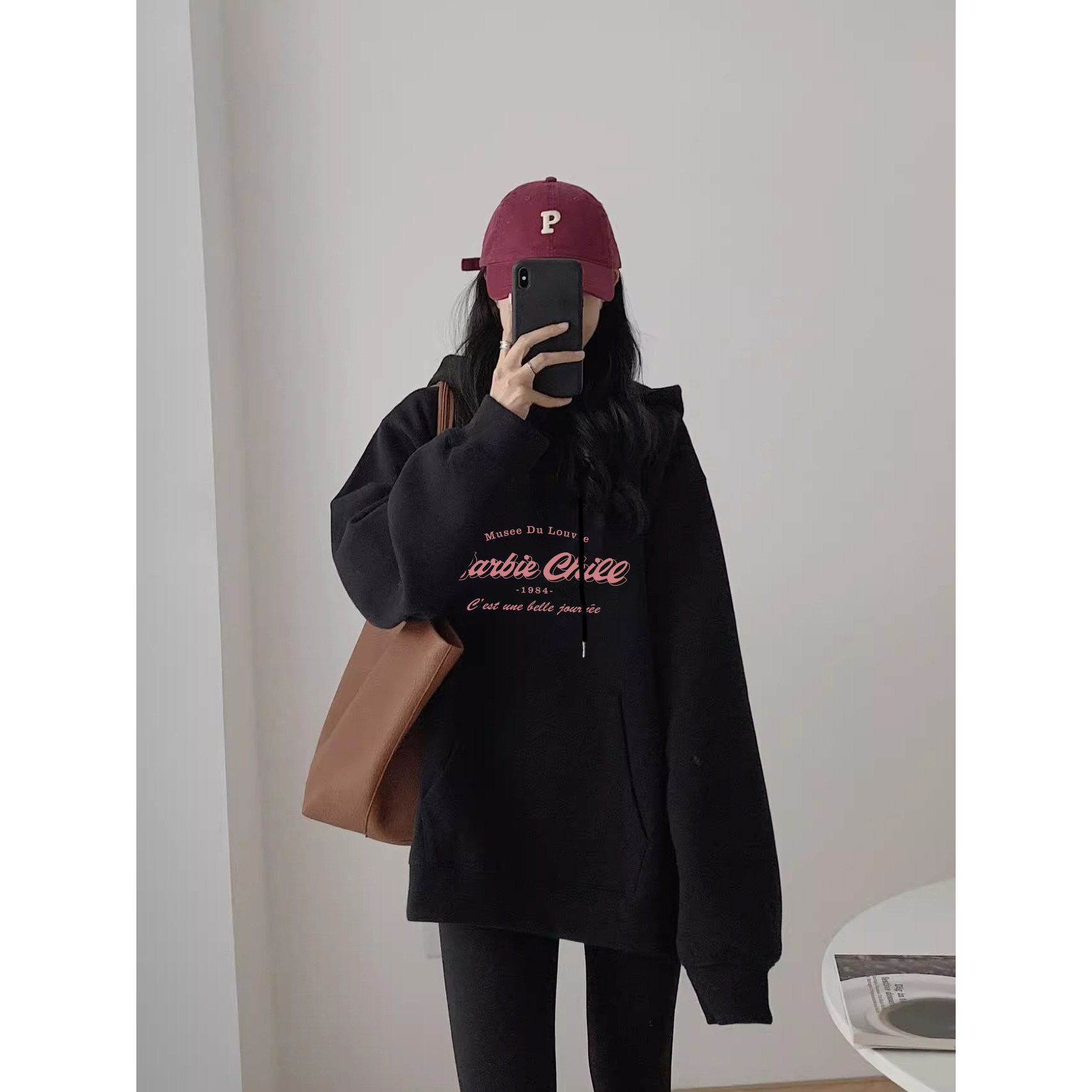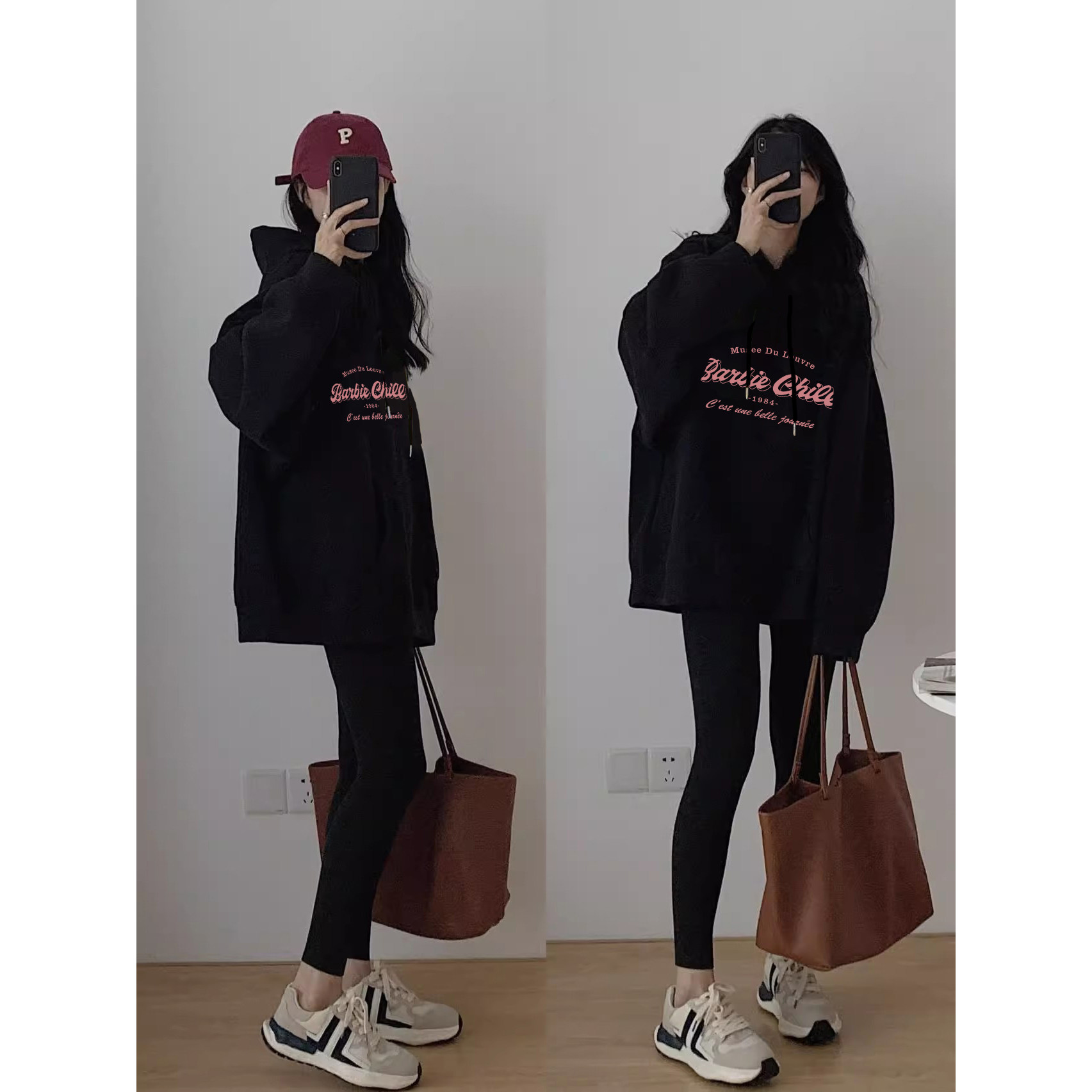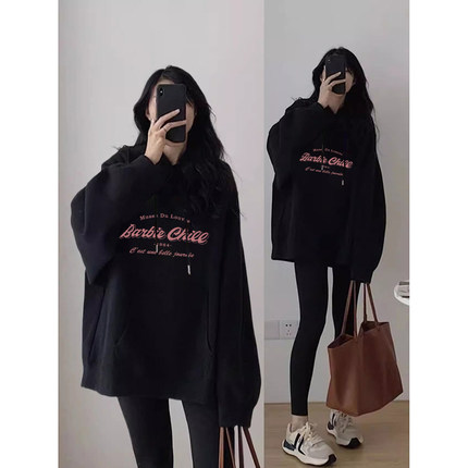 加绒卫衣女款2025新款无帽套头宽松慵懒风秋冬配鲨鱼裤的黑色上衣