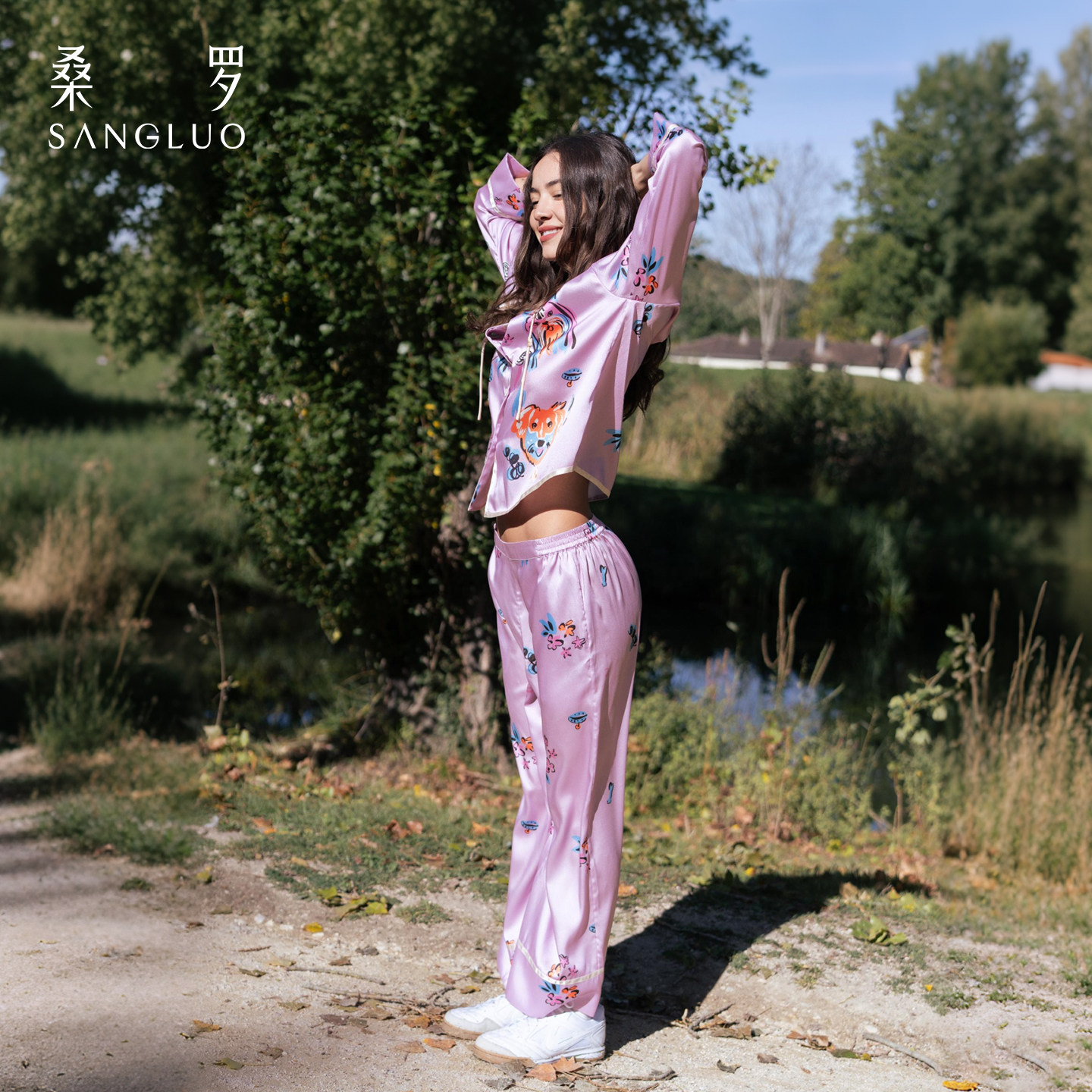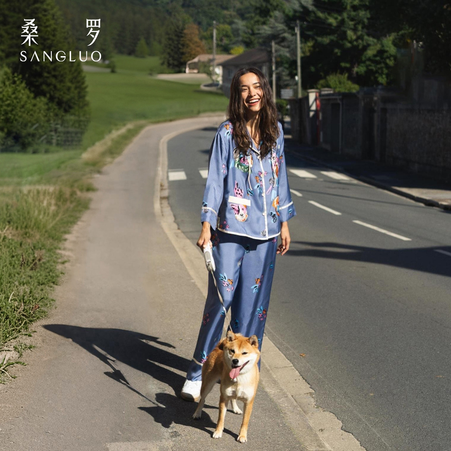 魔法小狗』桑罗真丝睡衣套装100%桑蚕丝女涂鸦印花可外穿家居服