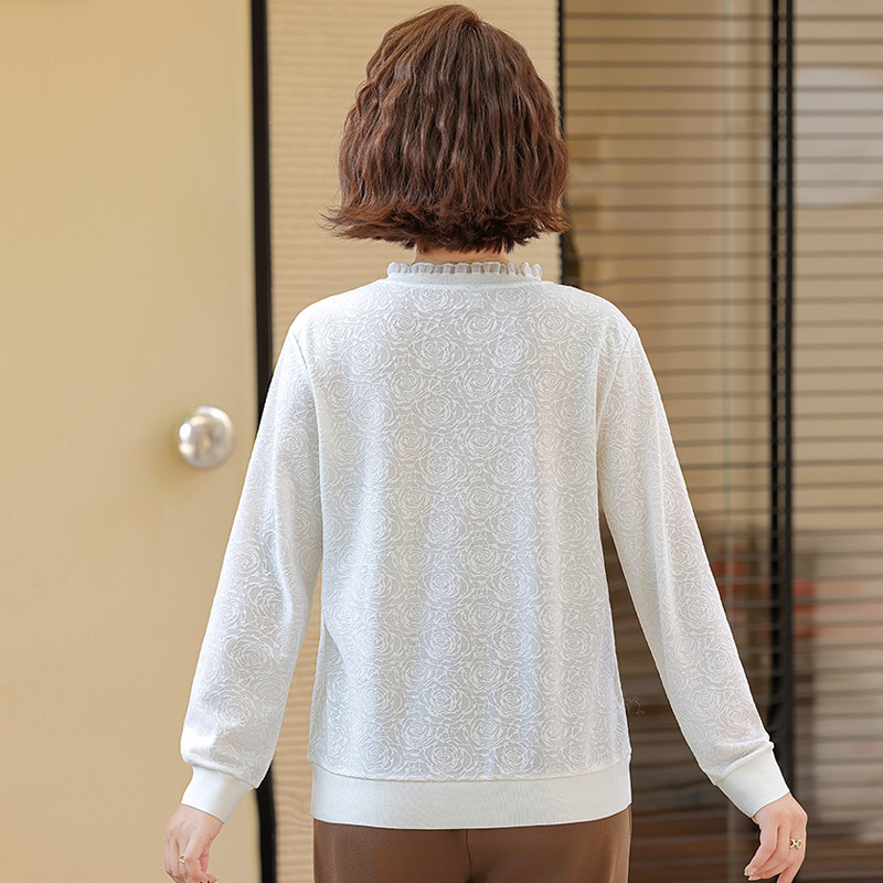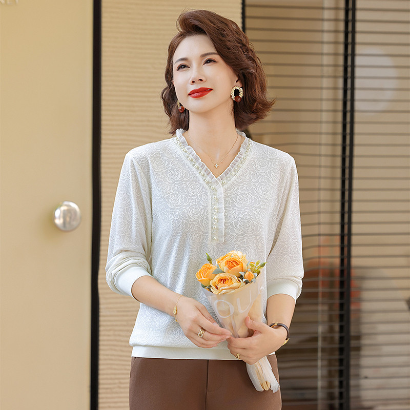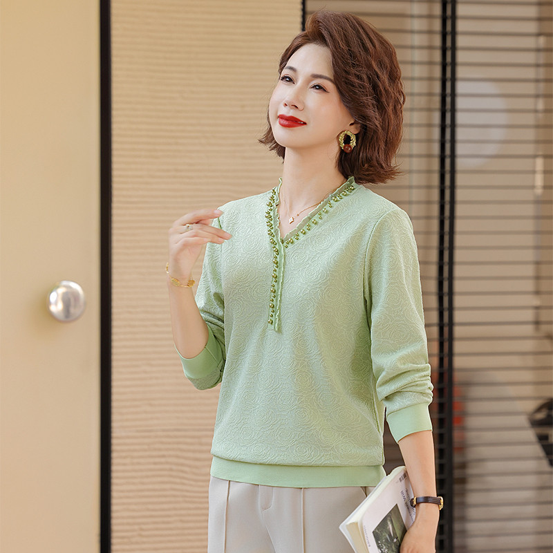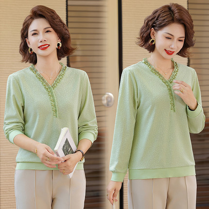 中老年时尚女装春季新款洋气宽松打底衫春装妈妈长袖v领t恤上衣