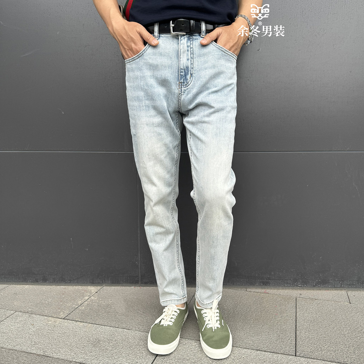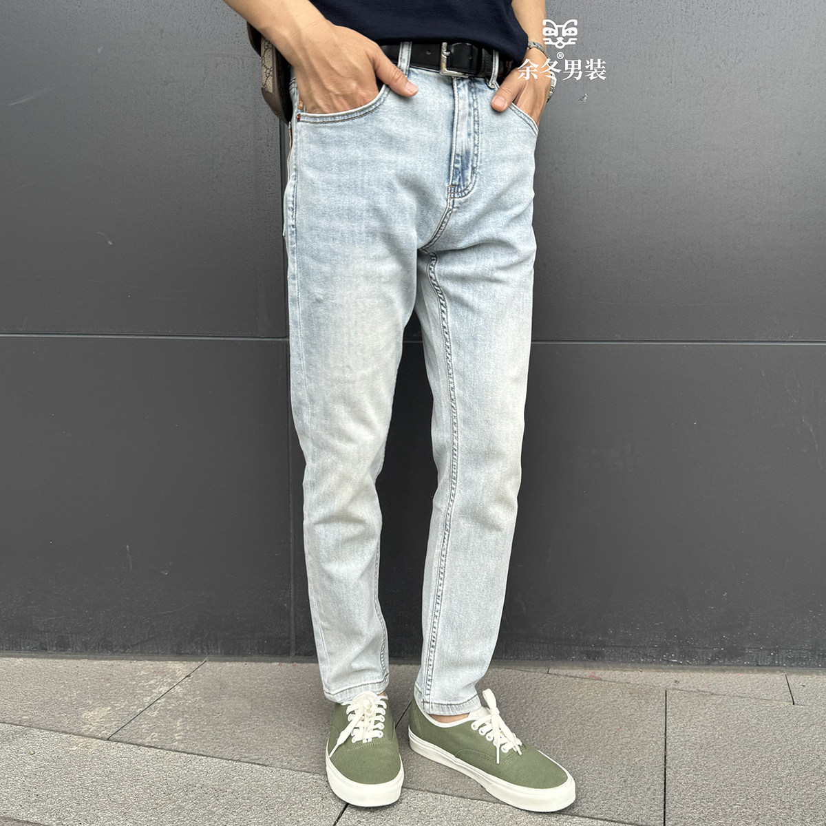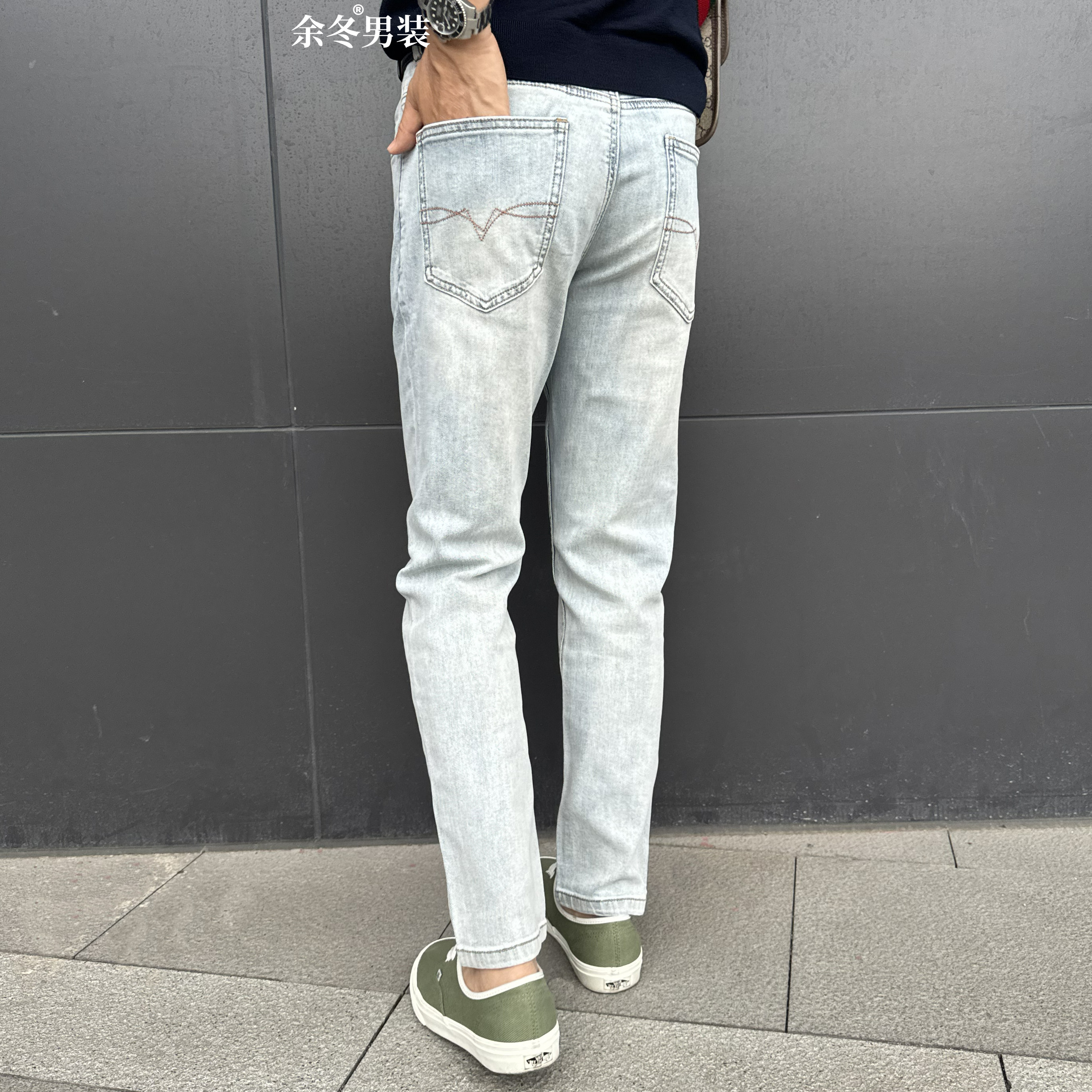 夏季薄款牛仔裤男士浅蓝色九分裤修身小脚9分裤弹力刺绣2个裤长选