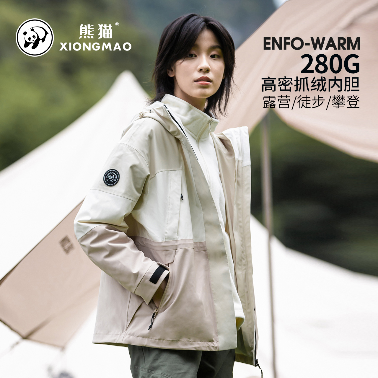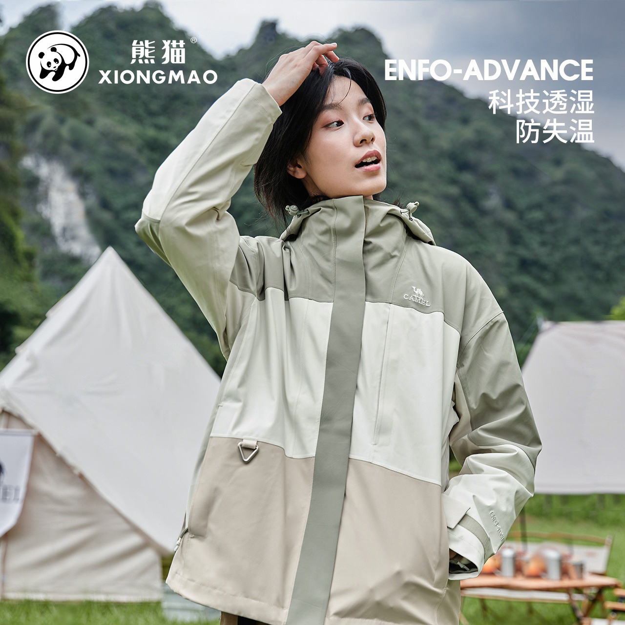 熊猫联名骆驼户外三防冲锋衣男女款三合一防风防水情侣装连帽外套