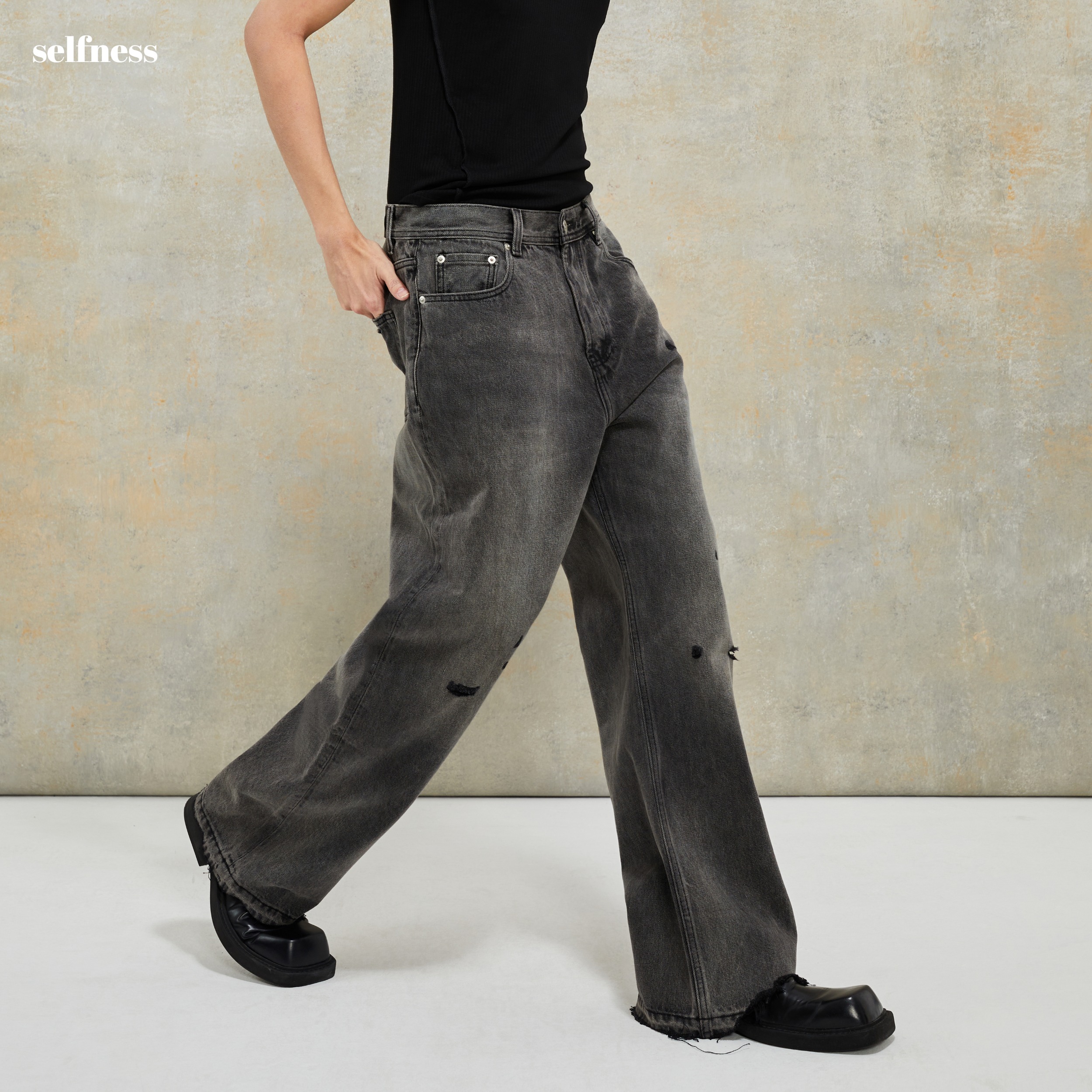 Selfness Vintage Denim水洗做旧破坏火烧拆边裤脚宽松微喇牛仔裤