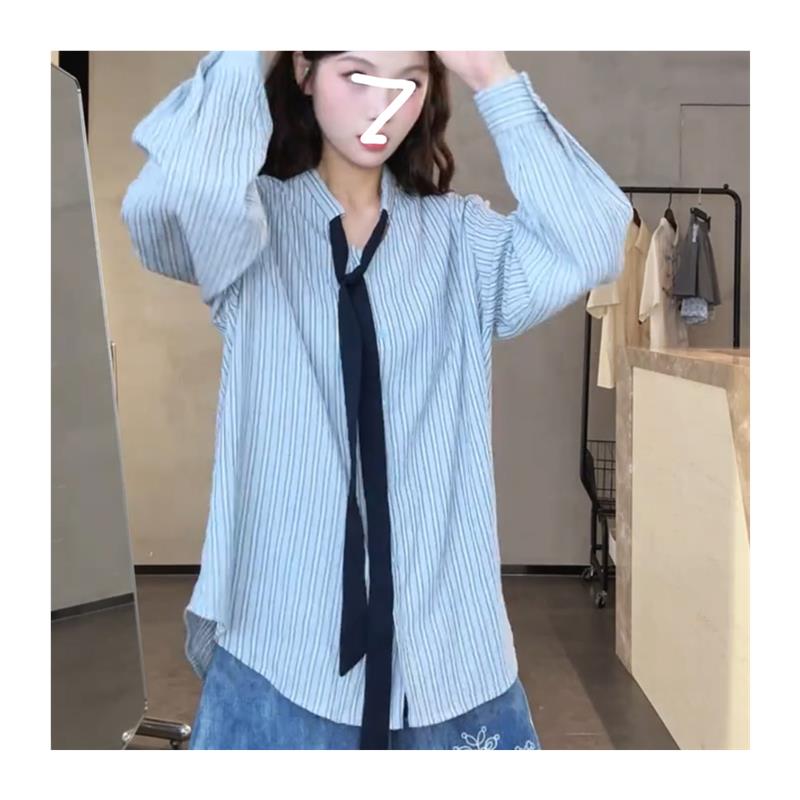 慵懒风格领带拼接垂直条纹长袖衬衫的妇女在初秋韩国风格宽松修身