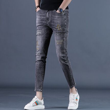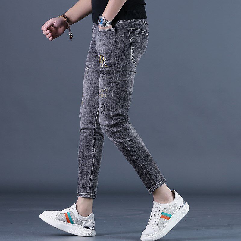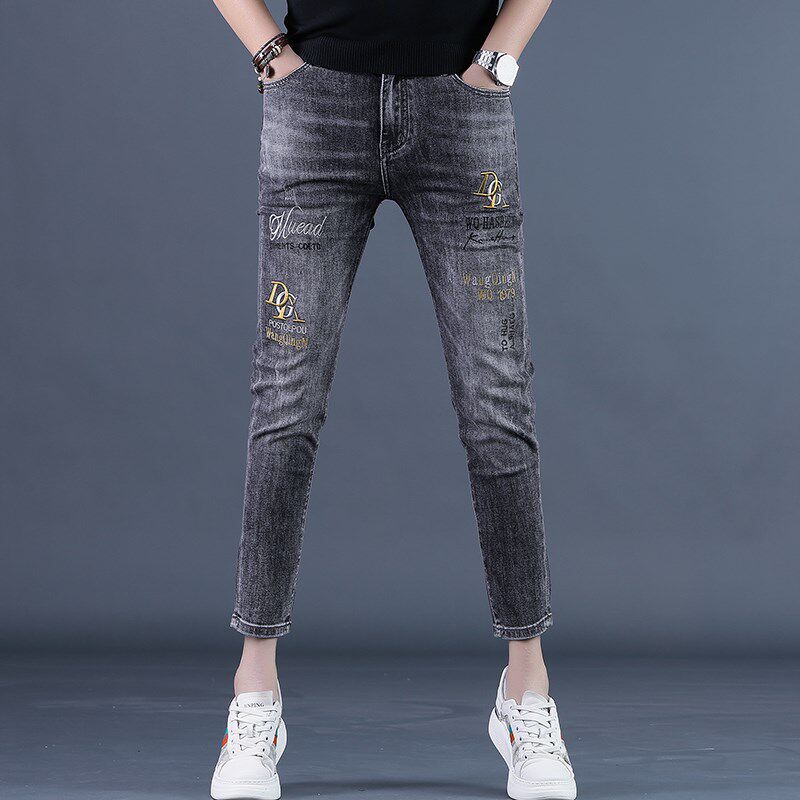 2025新款夏季薄烟灰色刺绣九分牛仔裤男修身小脚休闲男士9分裤子